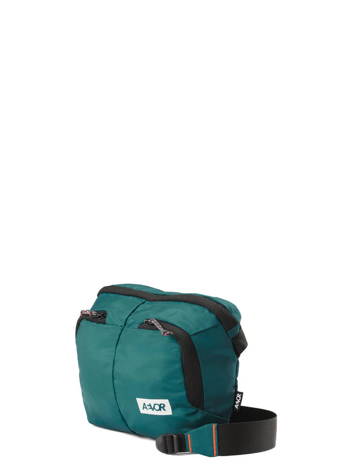 Die Sacoche Bag – Ripstop von AEVOR bietet 4 l Volumen bei kompakten Maßen von 25,5 × 8 × 18 cm. Mit 180 g Gewicht, verstellbarem Schultergurt (max. 123 cm) und wasserabweisendem Außenmaterial aus 100 % recycelten PET-Flaschen ist sie ein leichter, nachhaltiger Begleiter für Alltag und Reisen.