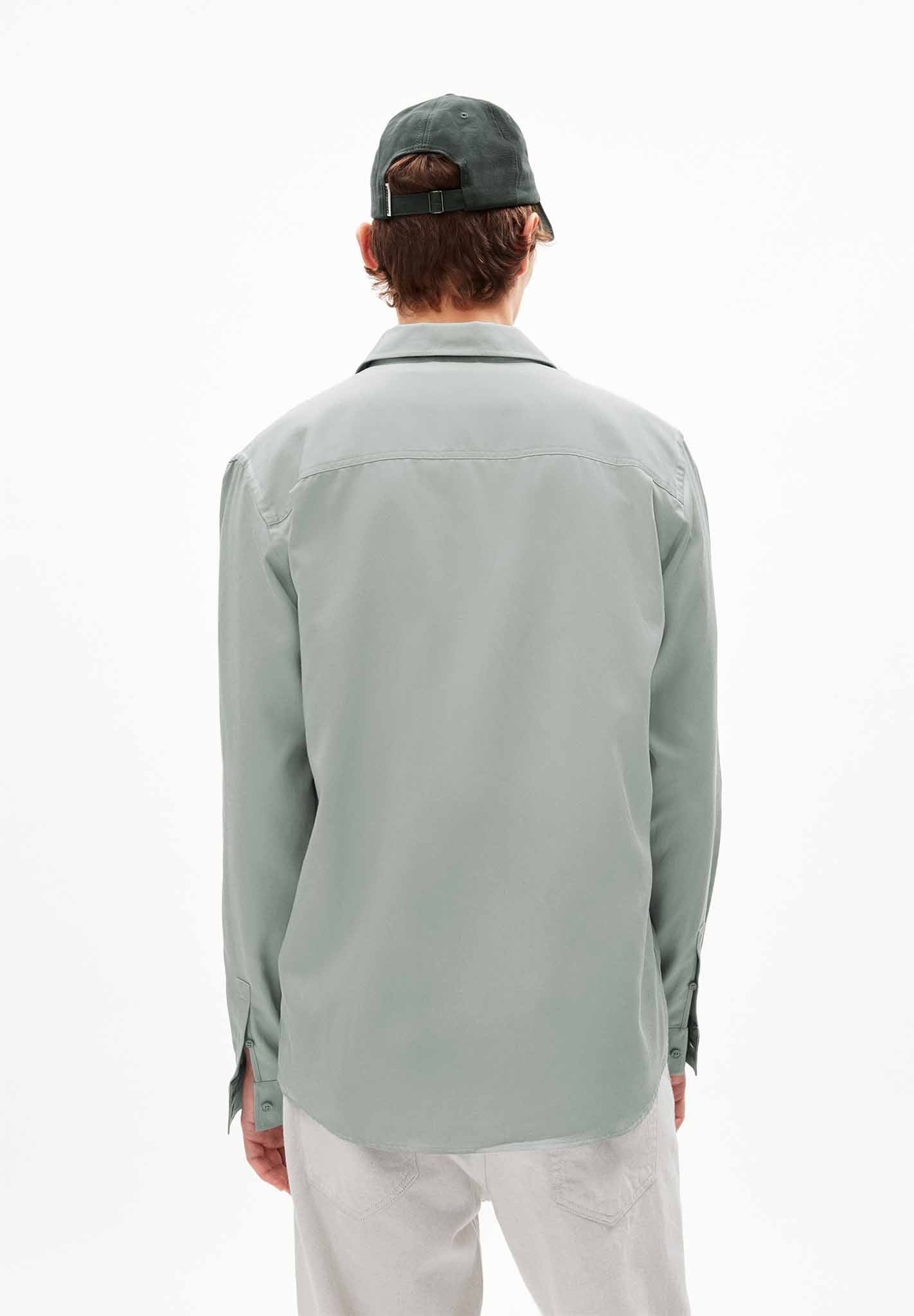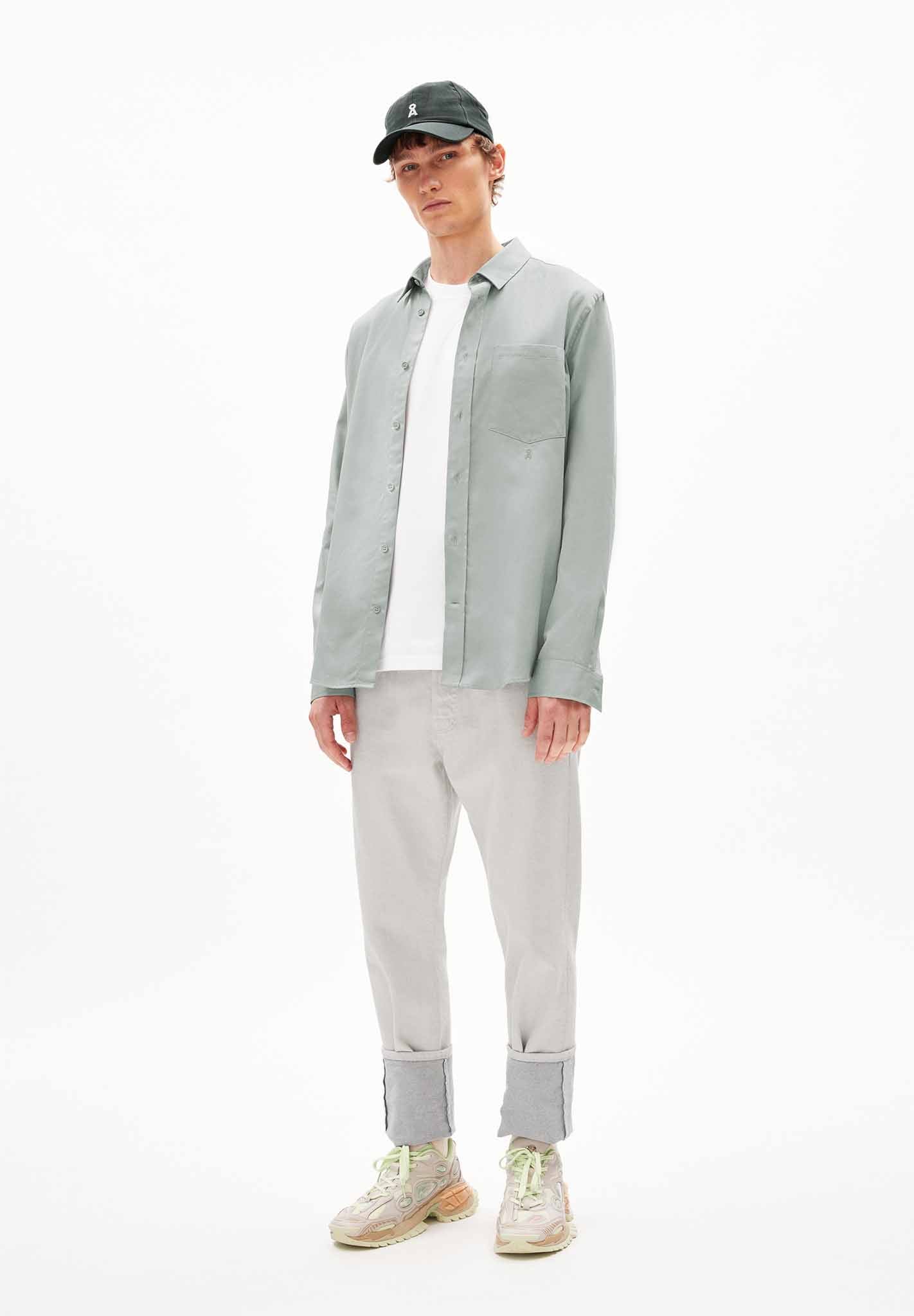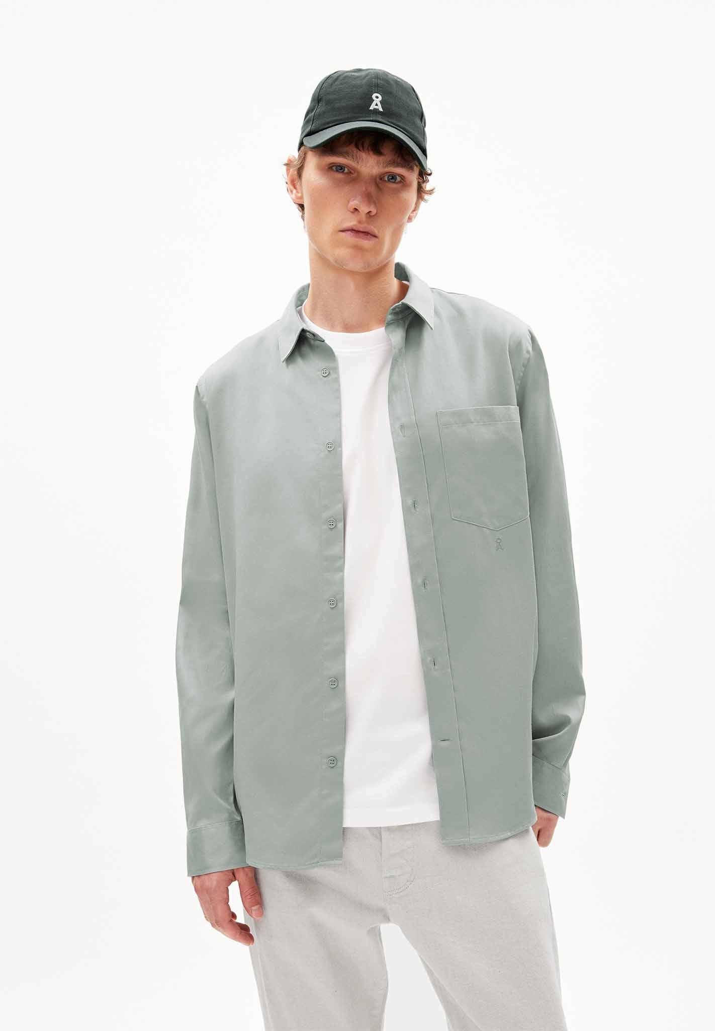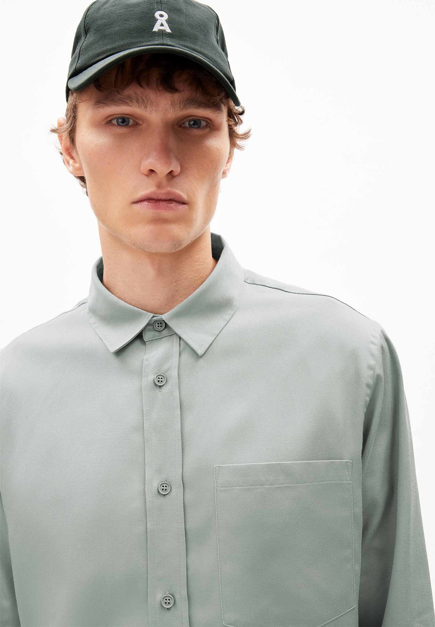 Skjortaas von Armedangels ist klassisch geschnitten, hat eine aufgesetzte Brusttasche und eine klasisschen Kragen. Das Hemd besteht aus 52% Lyocell (TENCEL™), 48% Baumwolle (bio). Model Lukas ist 187 cm groß und trägt Größe M.