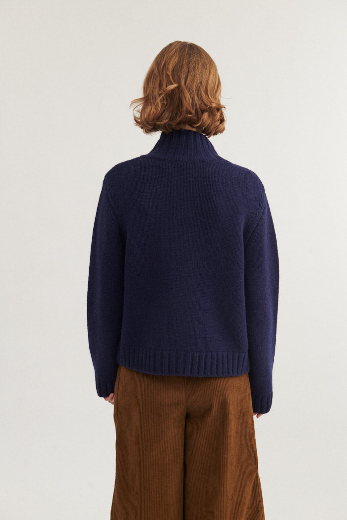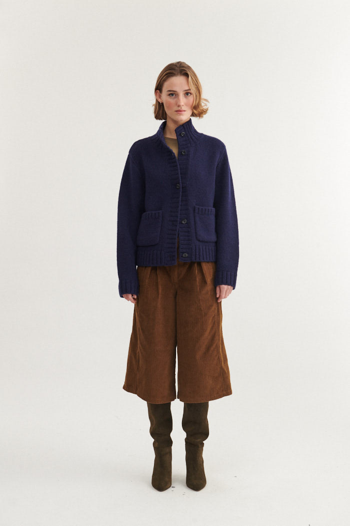 Blanche Cardigan hat einen hohen Kragen, eine Knopfleiste und aufgesetzte Taschen.