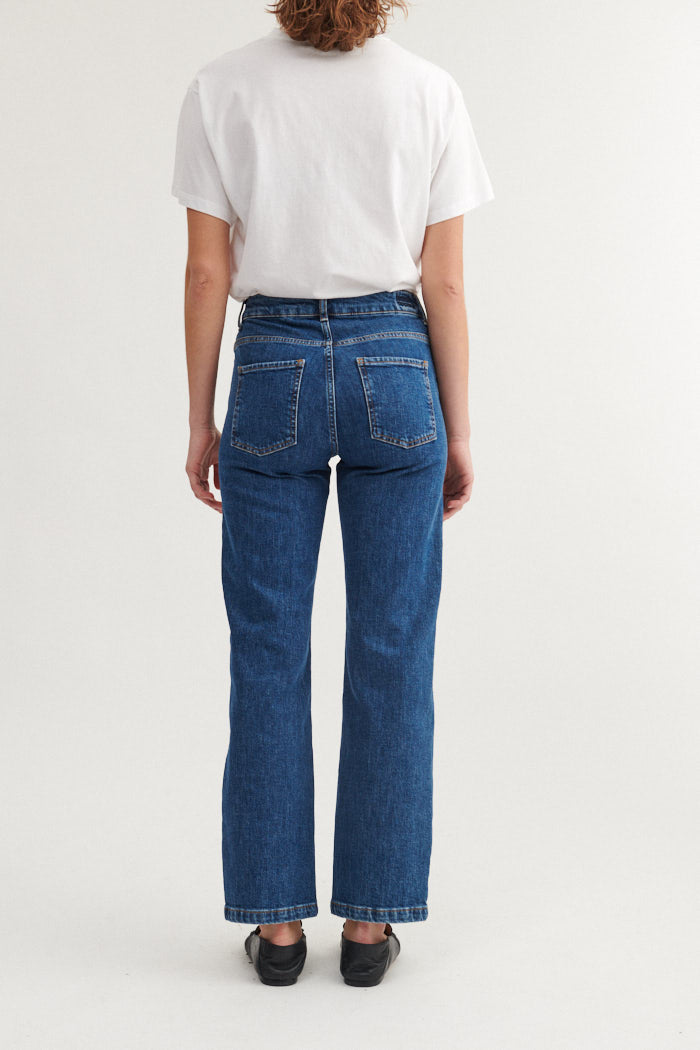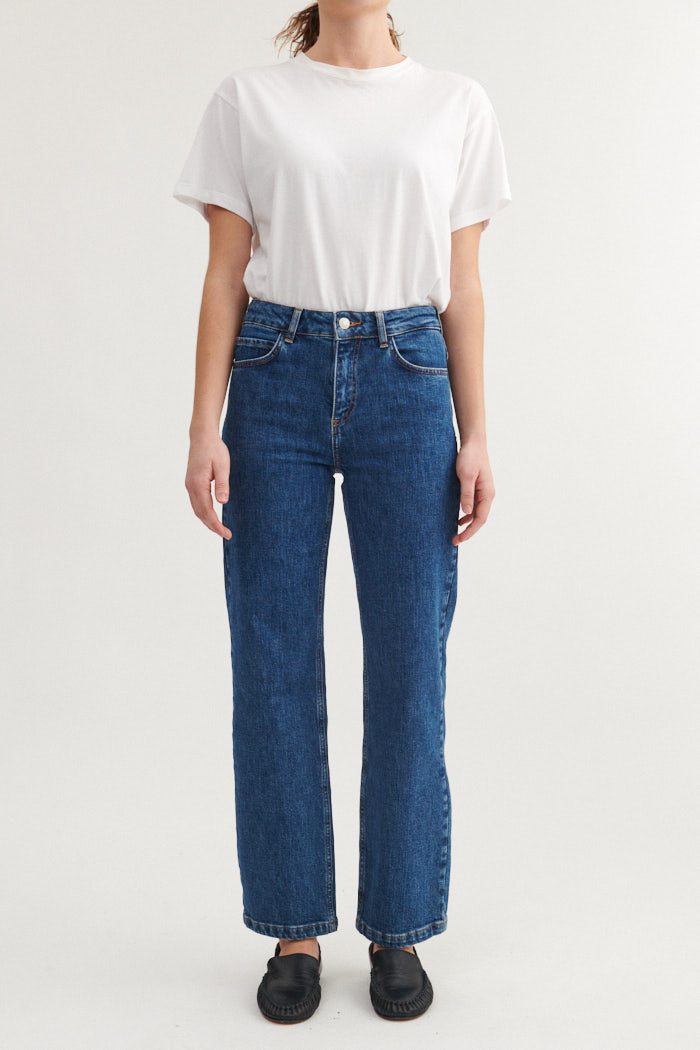 Die Jeans Elisa Mid Blue besteht aus einer Mischung aus 99% Baumwolle (Bio) und 1% Elastan. Die Jeans hat einen klassischen, geraden Beinschnitt und eine mittlere Leibhöhe.