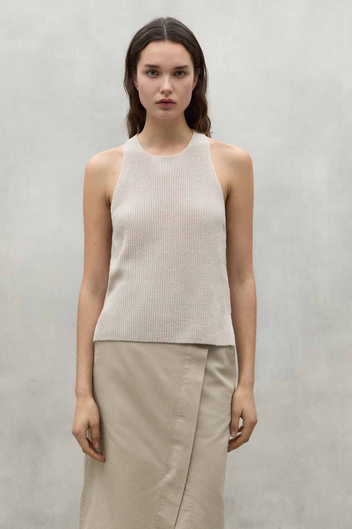 Das Stricktop Cidroalf von Ecoalf ist eher locker geschnitten. Es hat einen ausgefallenen Rückenausschnitt und vorne einen klassischen Rundhalsausschnitt. Das Oberteil besteht aus 55% Leinen und 45% Baumwolle (bio).