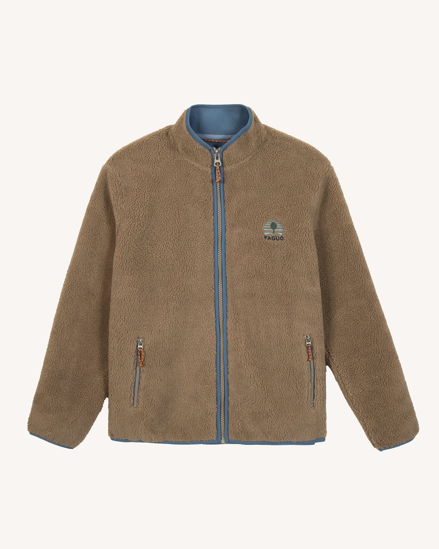 SENONCHE Jacke von FAGUO aus 100 % recyceltem Polyester. Doppelseitiges Sherpa außen, Microfleece innen, Reißverschluss vorne und Taschen, kontrastierende Details für Vintage-Look. Mit Outdoor-Stickerei – komfortabel und nachhaltig.