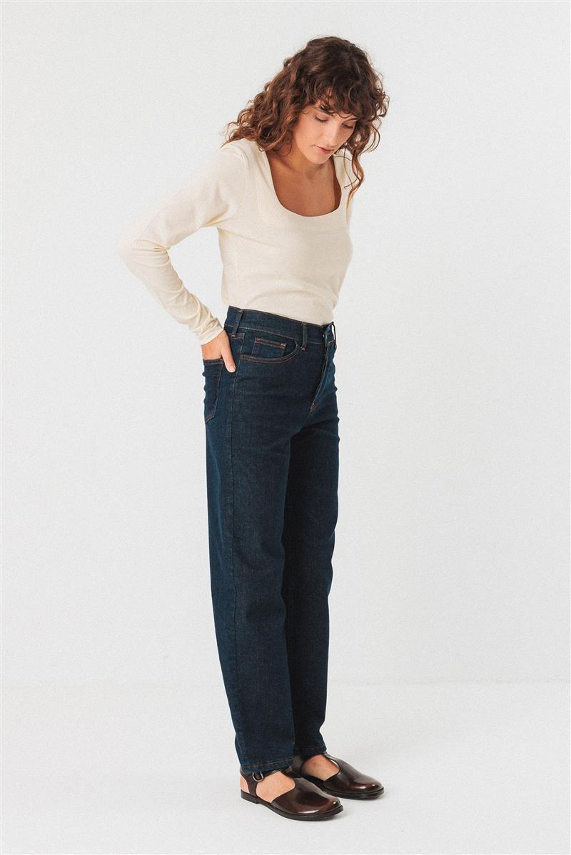 Ania Trouser von SKFK in dark denim, hergestellt aus 62% Baumwolle (Bio) Und 29%recy Co Und 7%eat Und 2% Elast.