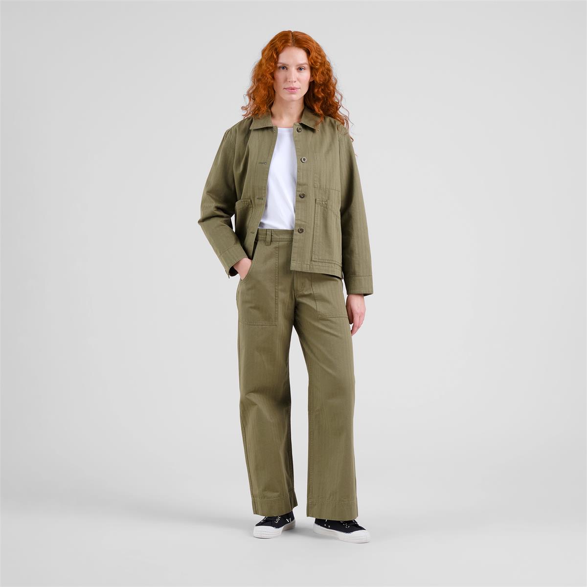 Die Workwear Pants Vara Herringbone von DEDICATED vereint zeitlosen Workwear-Stil mit modernem Komfort. Die Hose sitzt regulär, hat eine schmeichelhafte High-Waist-Passform und ein weites Bein für ein entspanntes Tragegefühl. Der elastische Bund am Rücken sorgt für Bequemlichkeit, während praktische Taschen vorne und hinten den Look abrunden. Gefertigt aus 100 % Bio-Baumwolle mit klassischem Fischgrätmuster bietet die Hose ein angenehmes Tragegefühl und steht für nachhaltige Qualität. Ob im Alltag, im Büro oder in der Freizeit – diese grüne Hose lässt sich vielseitig kombinieren und bleibt durch ihre hochwertige Verarbeitung lange ein Lieblingsstück.