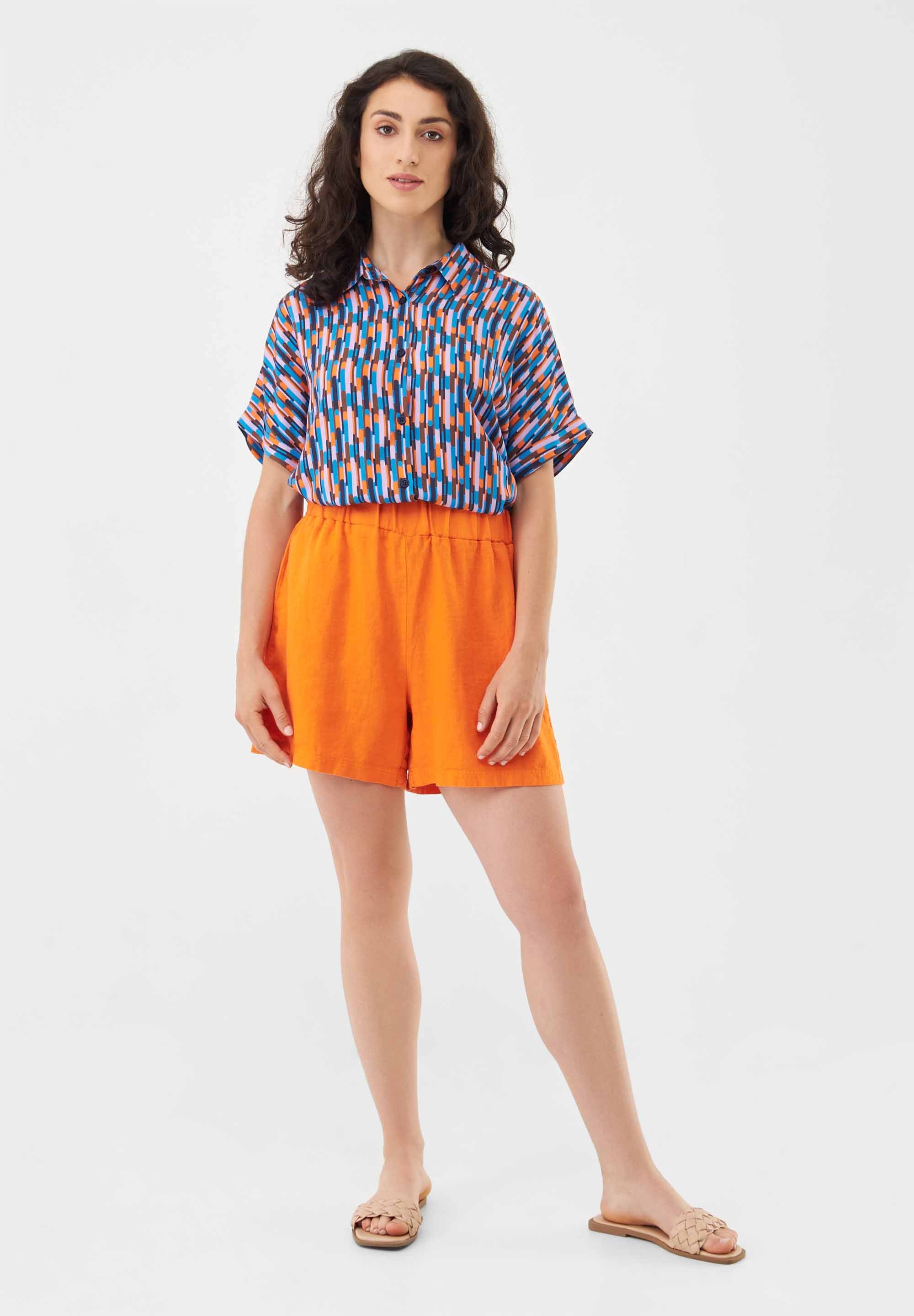 Shorts Cleo von Givn hat ein weites Bein, sitzt high waist und hat einen elastischen Bund. Die kurze Hose wurde aus 100% Leinen gefertigt. Das Model ist 1,70 m groß und trägt Größe S.