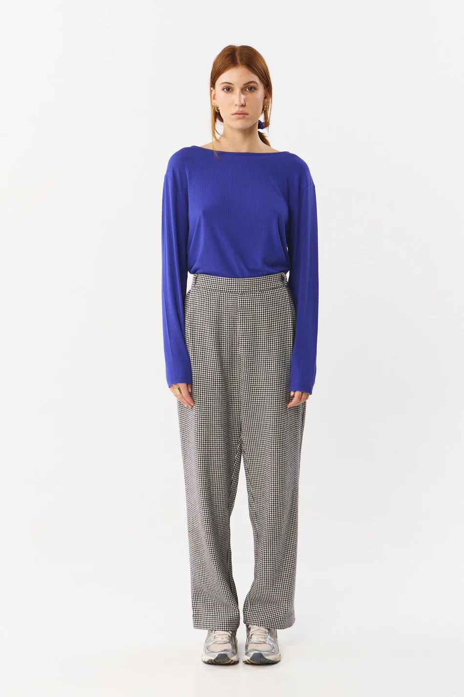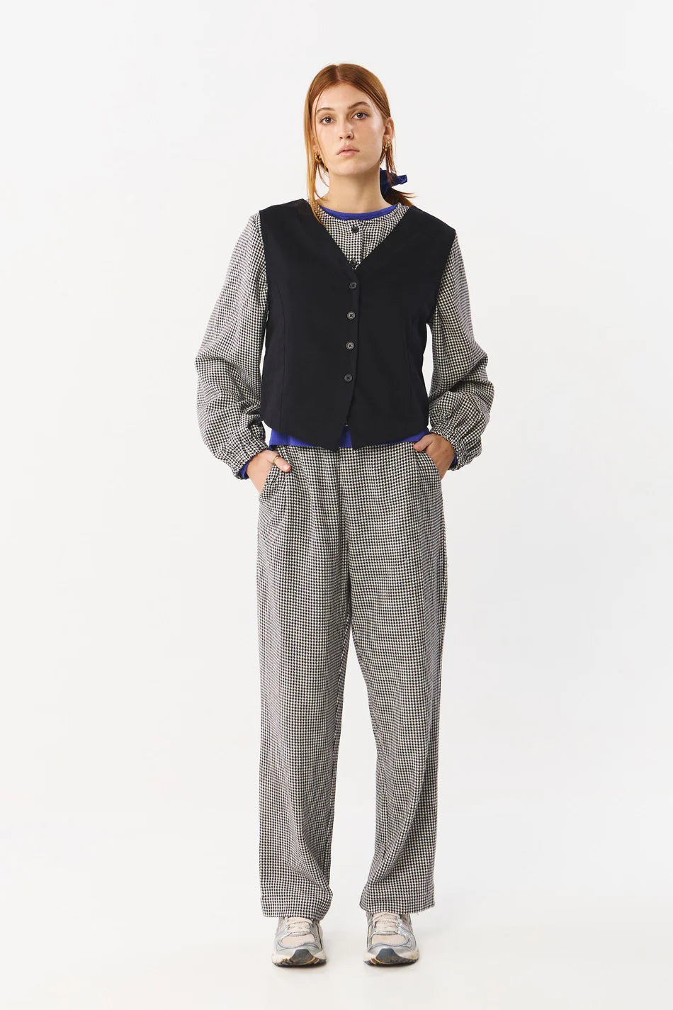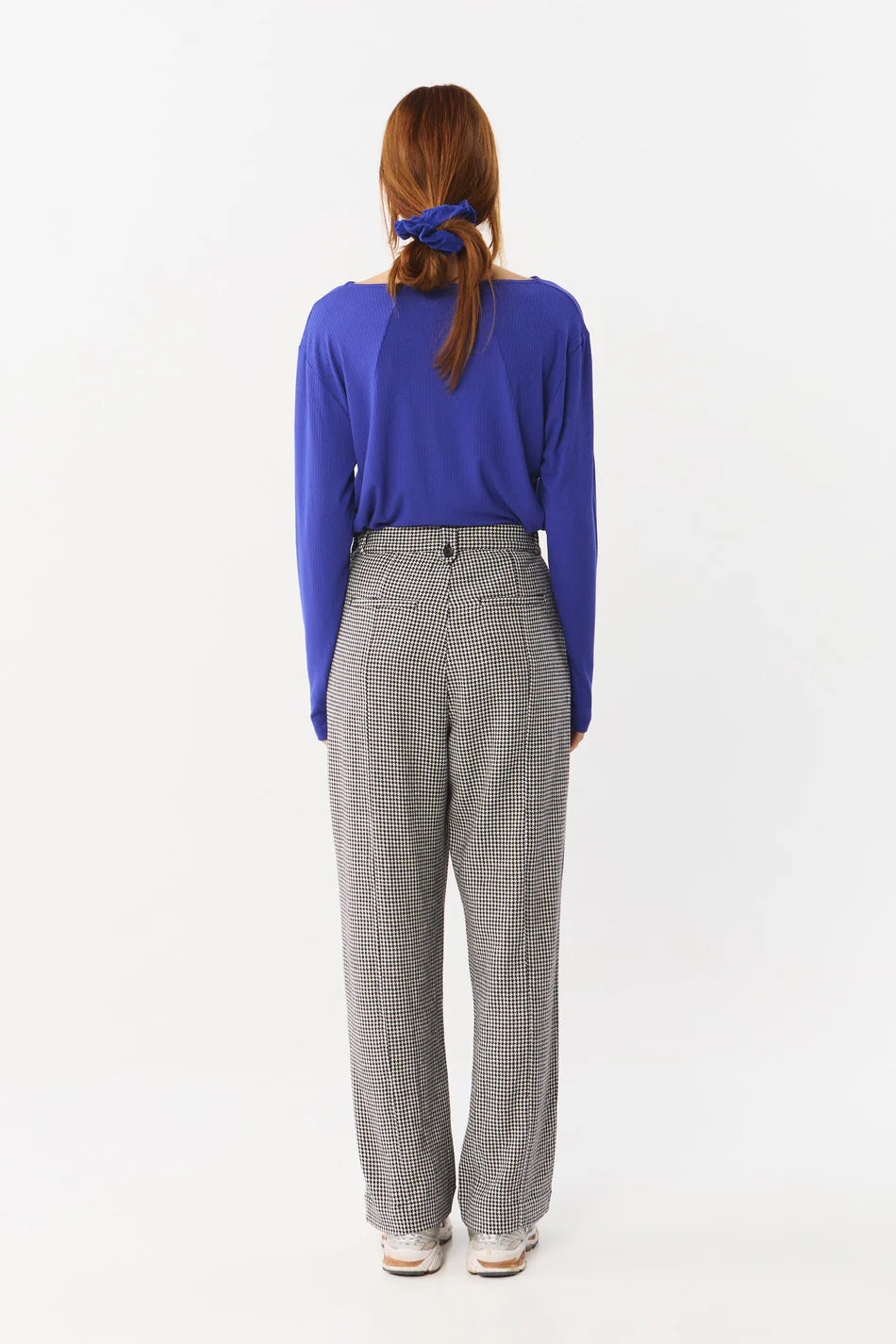 Die Joplin Hose von SUITE 13 vereint klassische Schneiderkunst mit moderner Silhouette. Aus 100% Bio-Baumwolle in dezentem Hahnentritt-Muster gefertigt, überzeugt die Hose mit geschwungenem Bein, komfortabler Passform und klaren Linien. Der seitliche Reißverschluss und der Corozo-Knopf sorgen für einen sauberen Verschluss, während Fronttaschen praktische Funktionalität bieten. Die Hose sitzt natürlich an der Taille und verleiht jedem Outfit eine moderne, elegante Note.