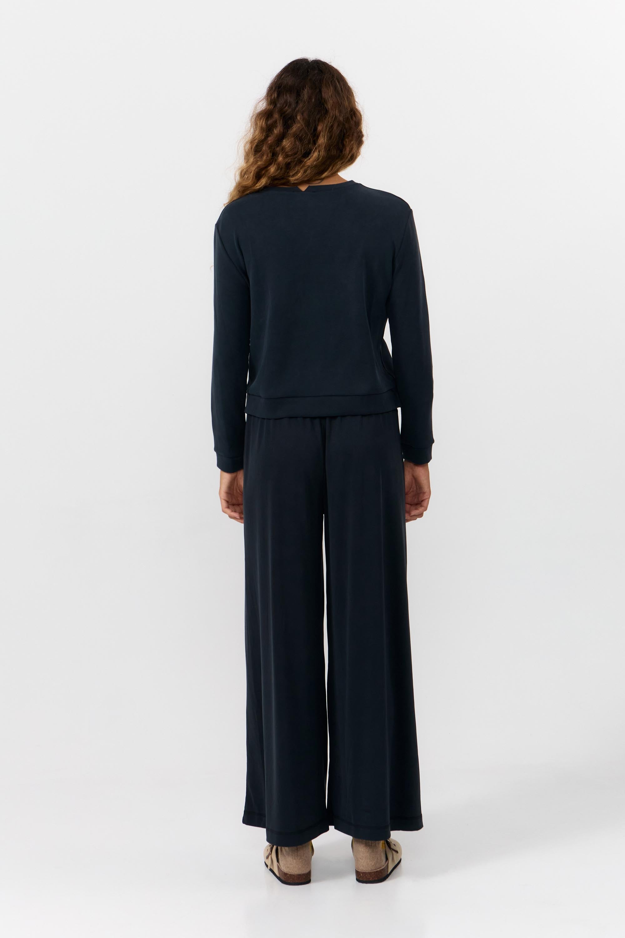 Hose mit weitem Bein aus Jersey-Cupro-Touch, mit vorderen Seitentaschen und elastischem Bund. Yala von SUITE 13 gefertigt aus 49% TENCEL™ Modal, 43% PES und 8% Elasthan.