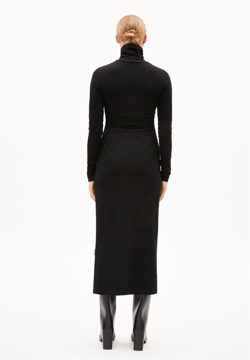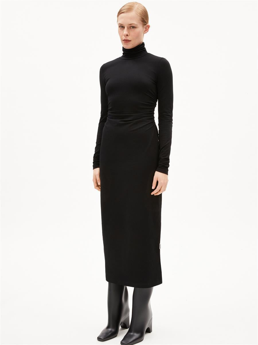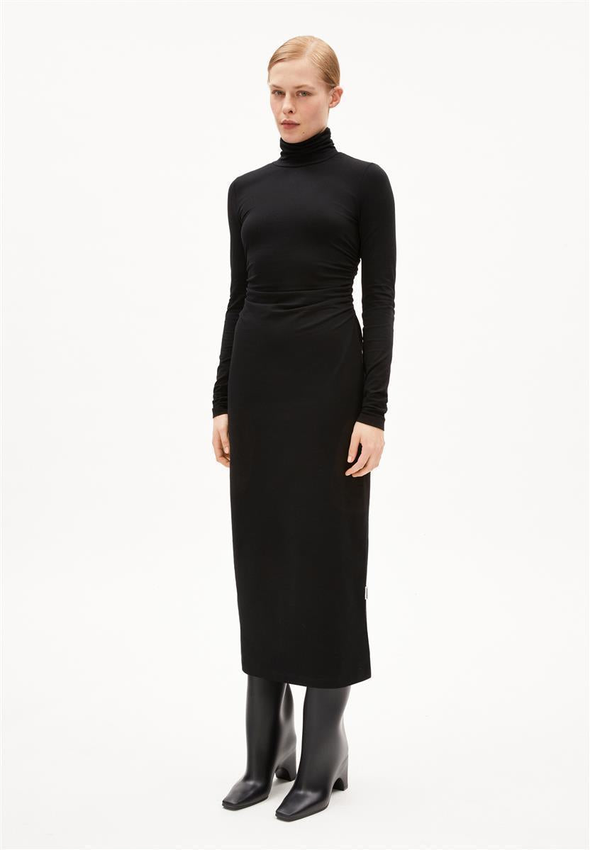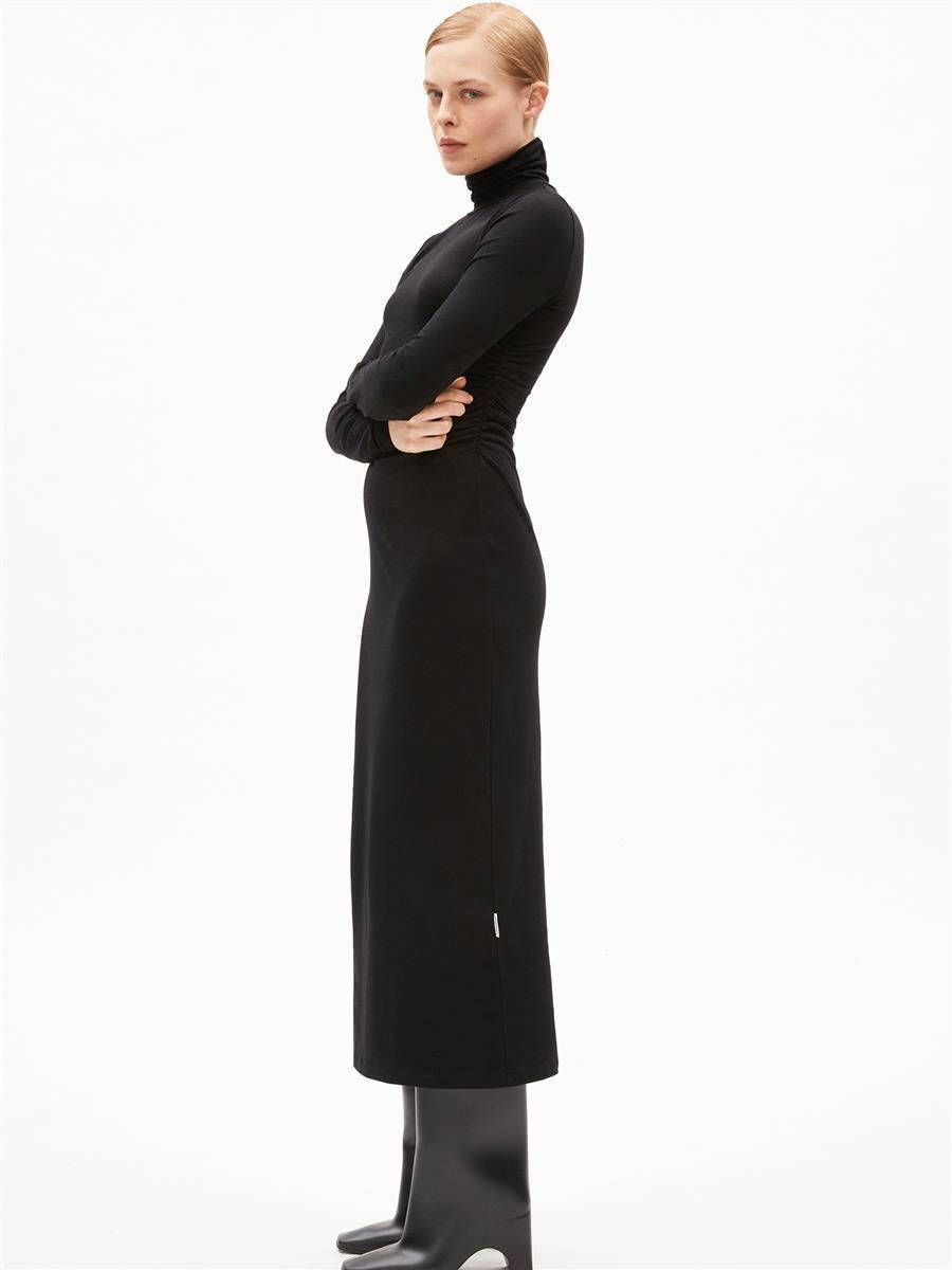 Das Kleid Adaaja von ARMEDANGELS ist eng geschnitten und mittellang. Es besteht aus 96% Baumwolle (Bio) und 4% Elasthan.