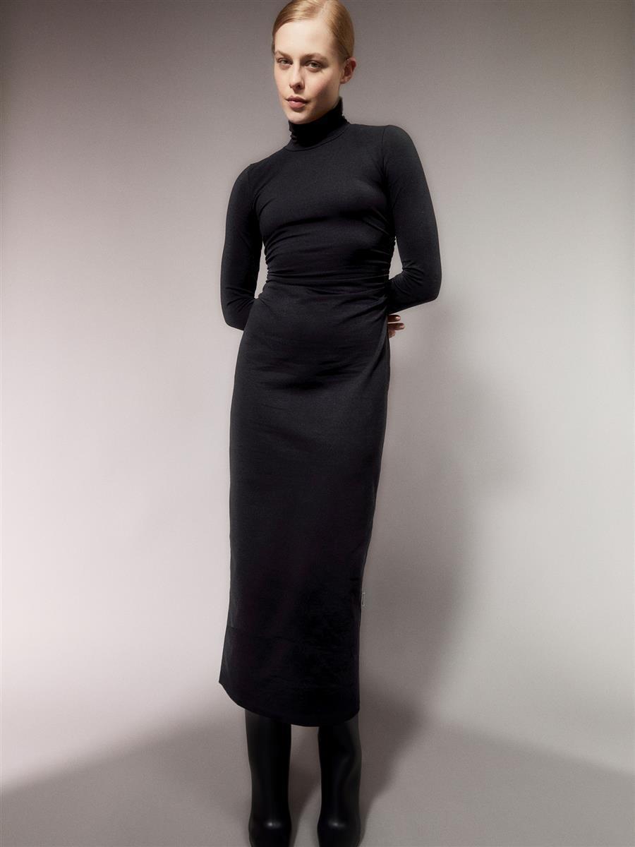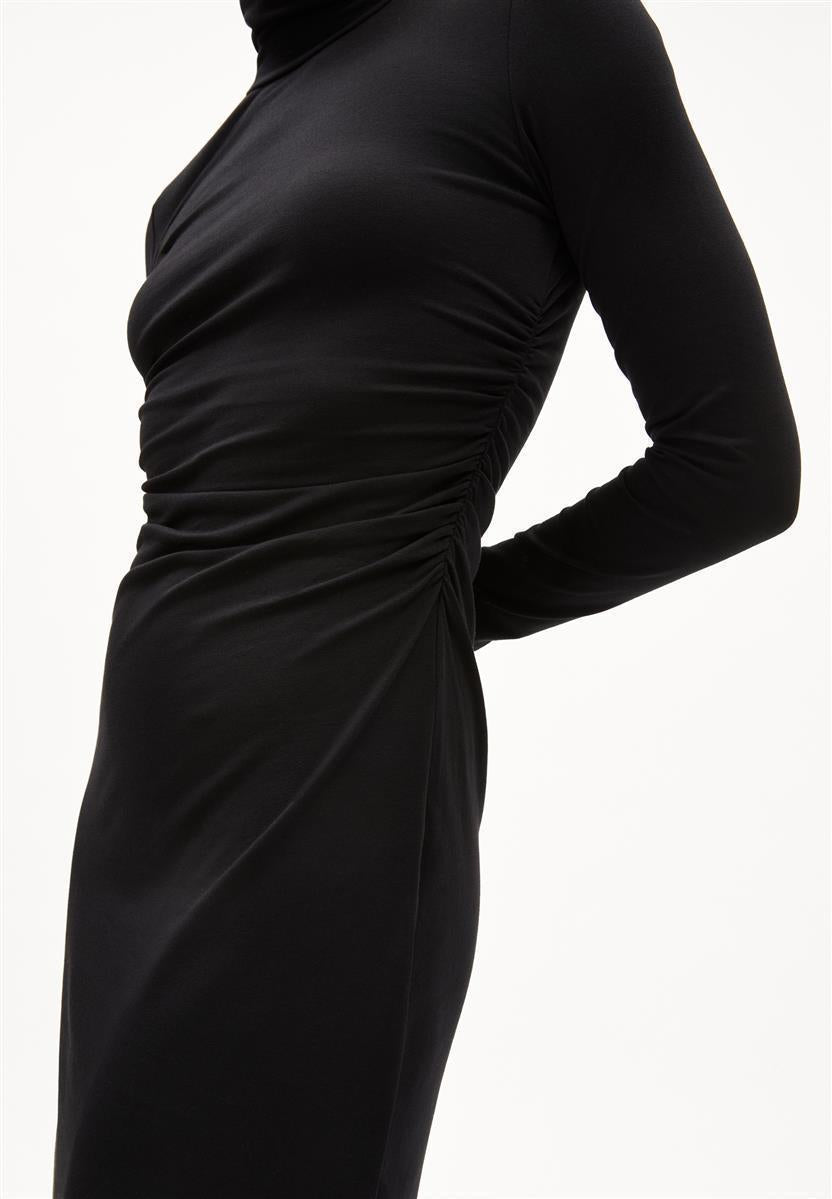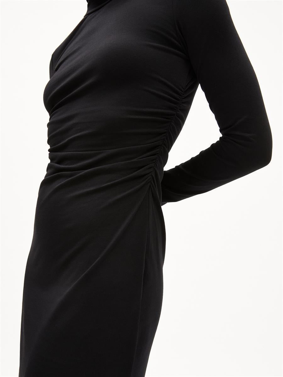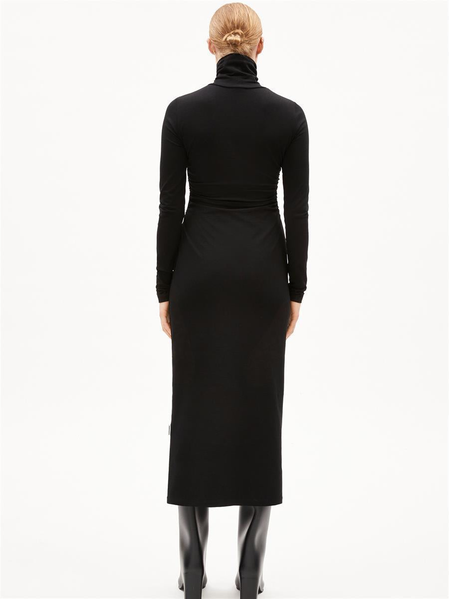 Das Kleid Adaaja von ARMEDANGELS ist eng geschnitten und mittellang. Es besteht aus 96% Baumwolle (Bio) und 4% Elasthan.