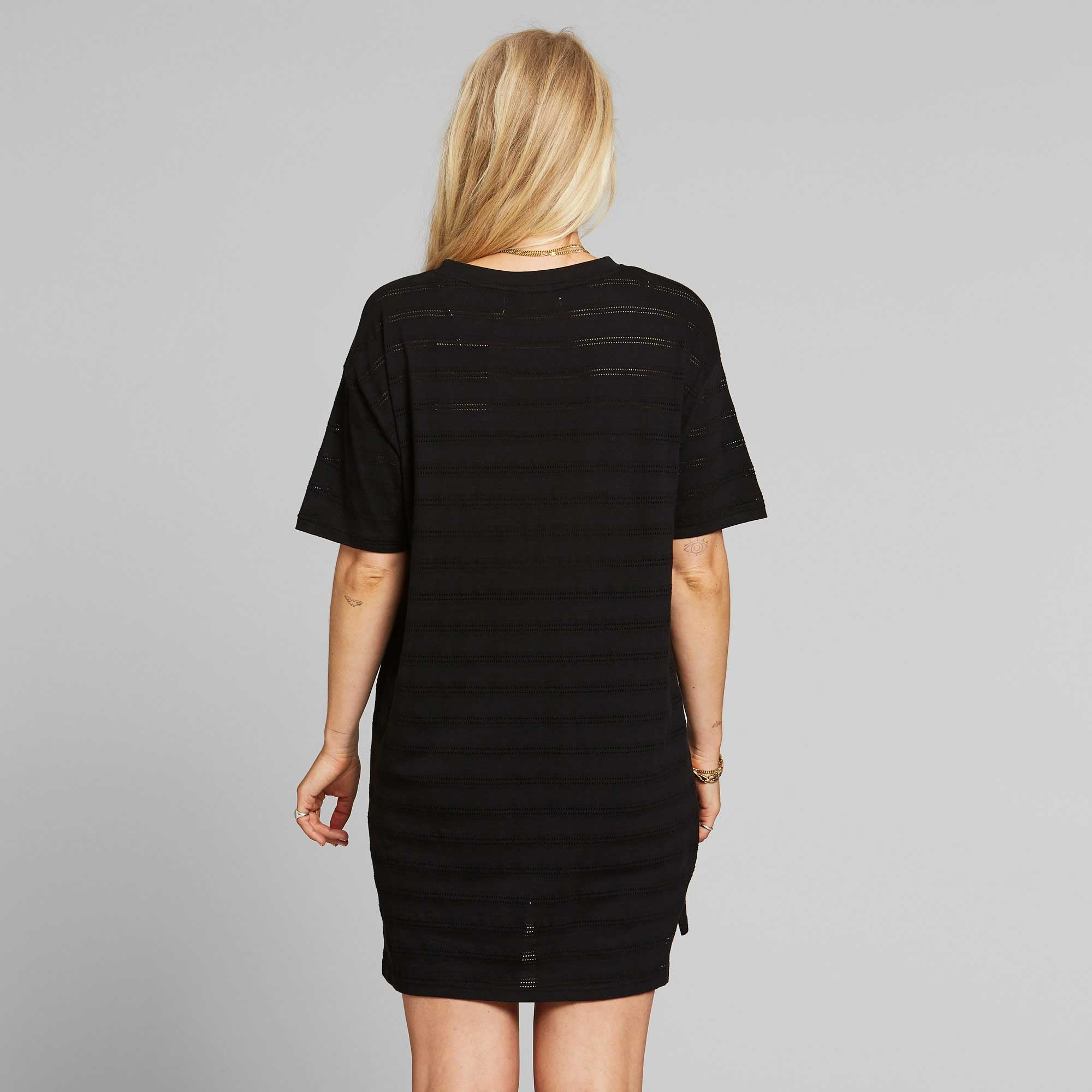 Das Kleid Alta Lace von Dedicated besteht aus 100% Baumwolle (bio) und ist mit der gestreiften Perforierung ein verspieltes Basic Kleid.