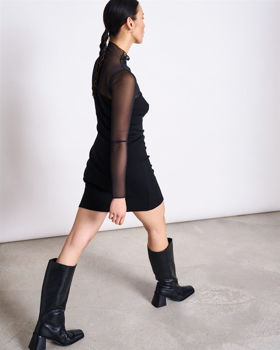 Das MESH DRESS HUARI von JAN'N JUNE vereint Eleganz und Selbstbewusstsein in einem modernen Design. Mit leichtem Stehkragen, schmalem Schnitt und kurzer Länge ist es das perfekte Piece für besondere Anlässe oder stylische Alltagslooks.