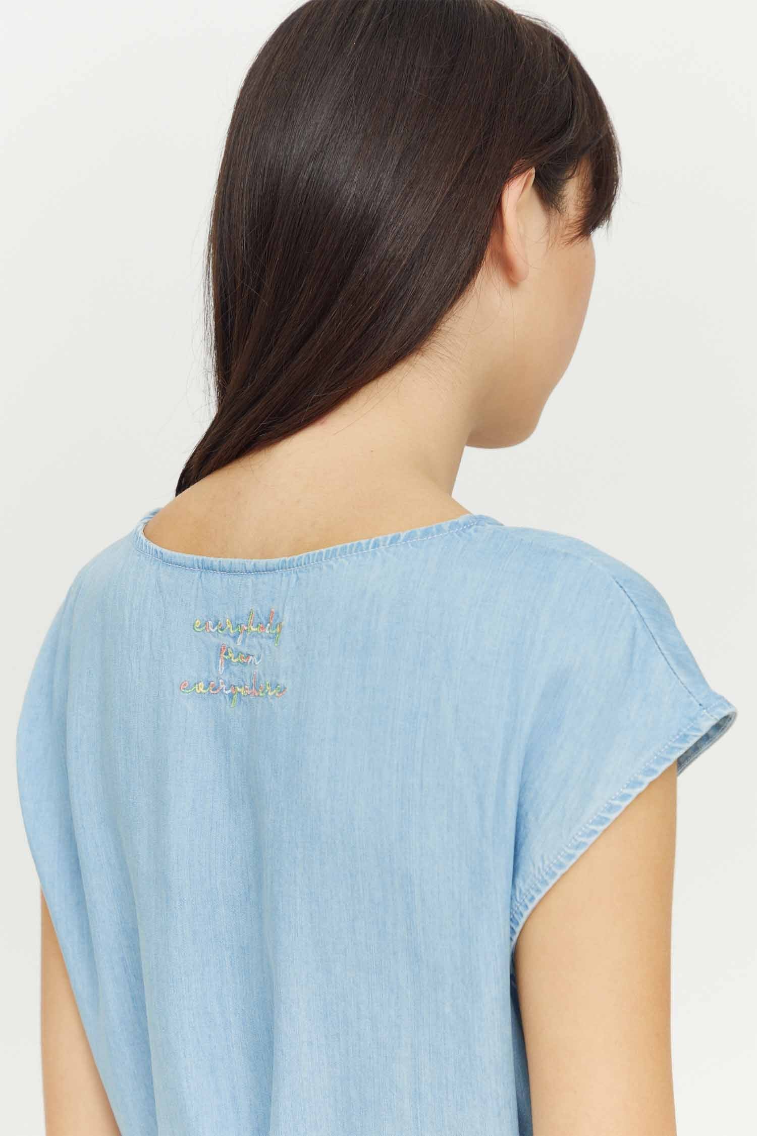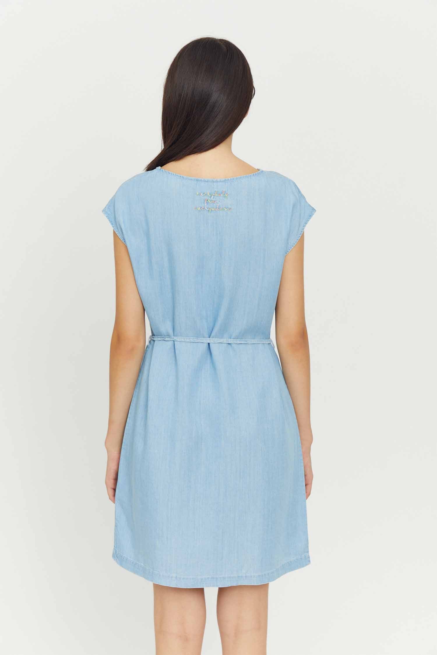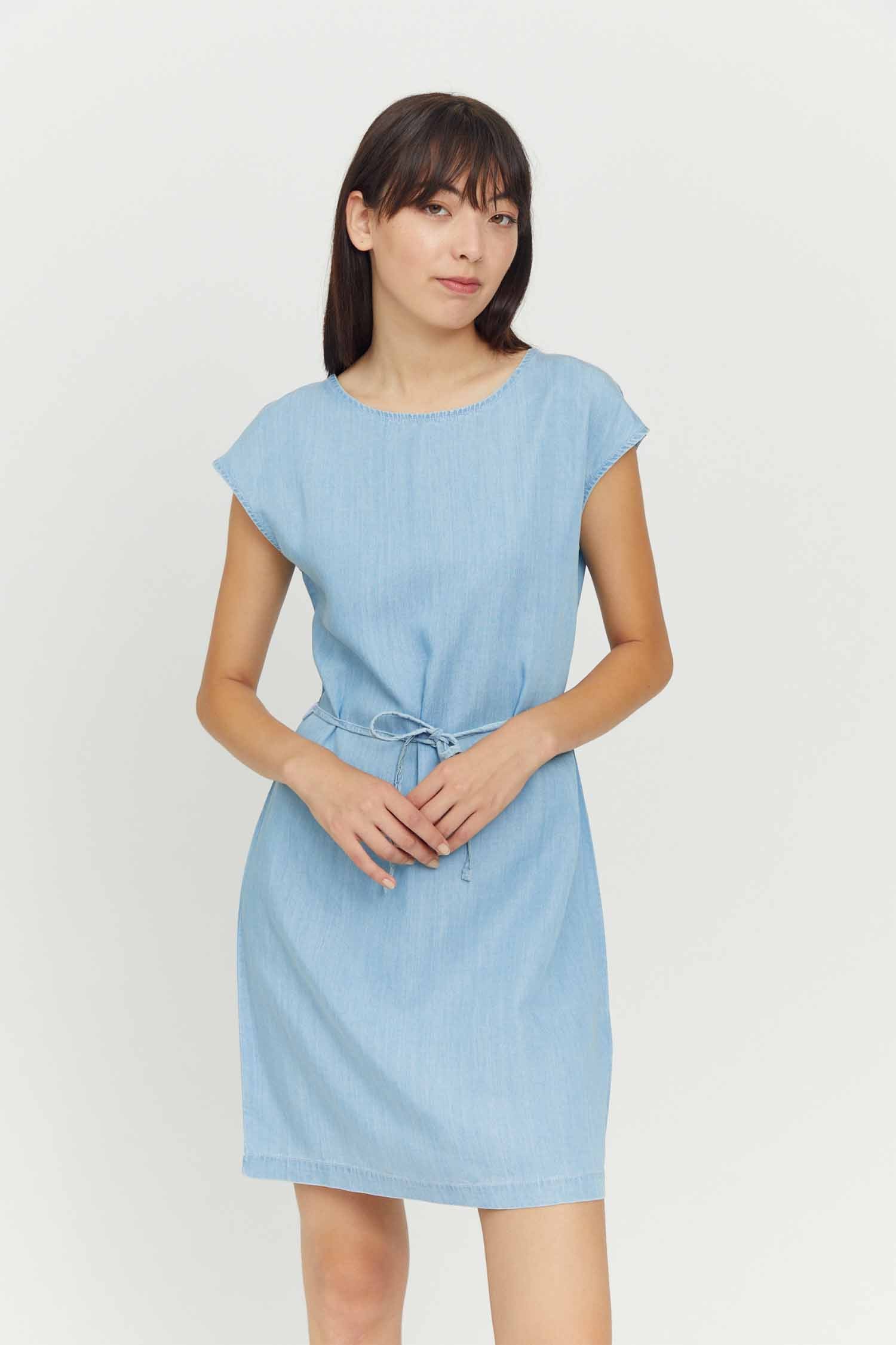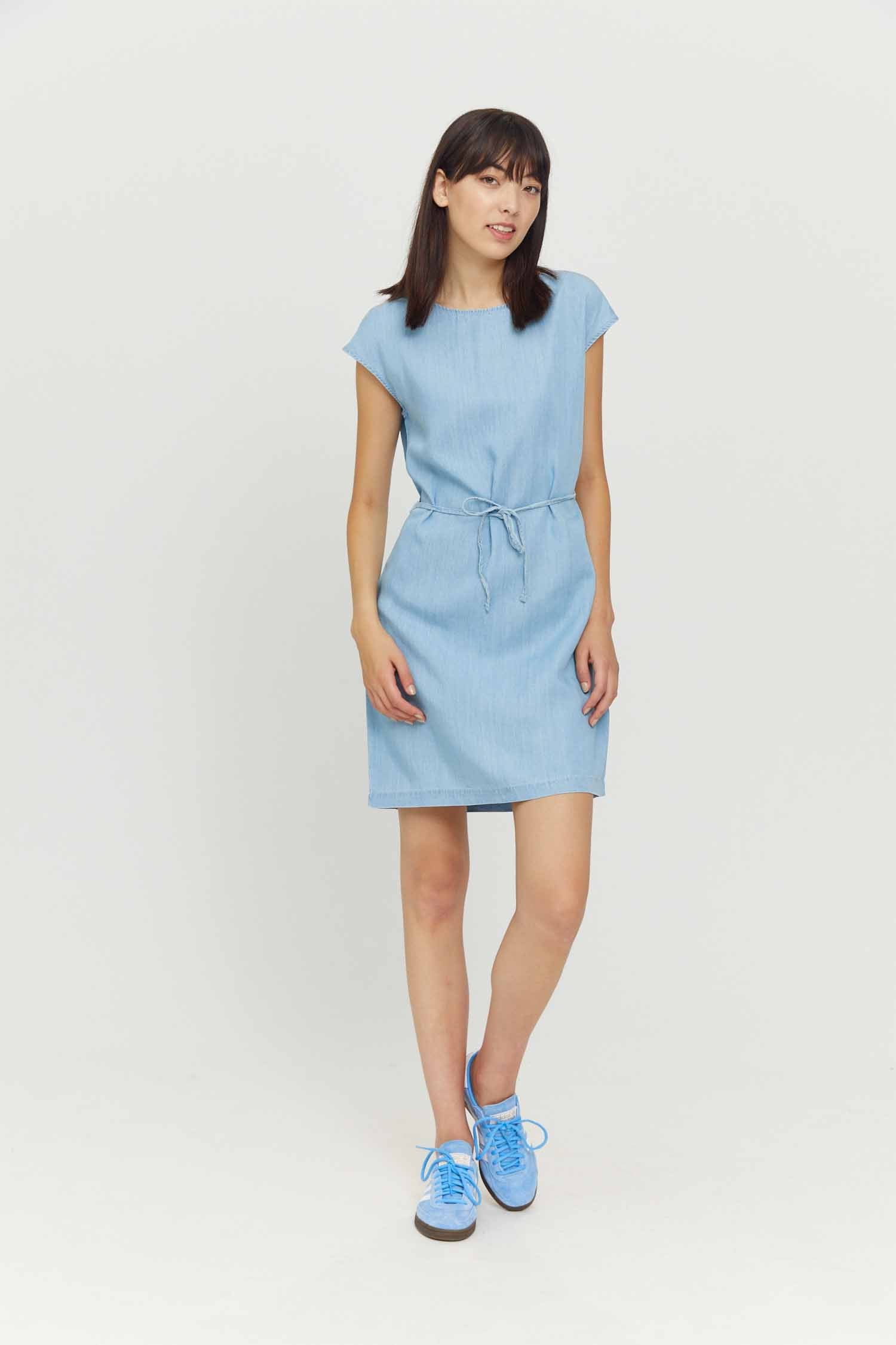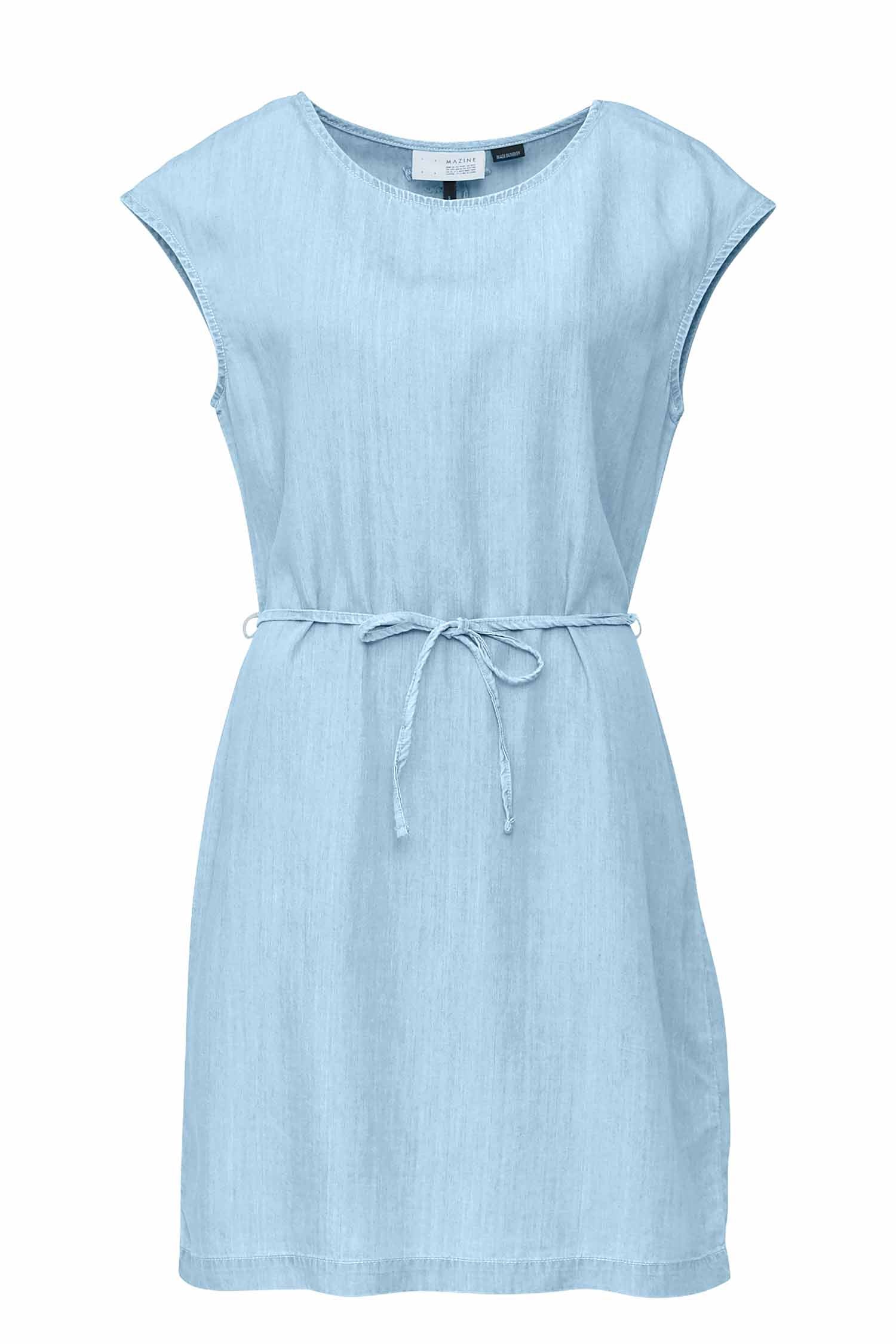 Das Kleid Irby von Mazine ist gerade geschnitten und hat eine normale bis lockere Passform. Es hat eine Kordel in der Taille und kurze Ärmel. Das Sommerkleid hat einen modernen Denim-Look und besteht zu 100% aus Viscose (LENZING™ECOVERO™).