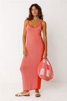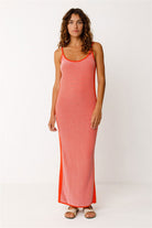 Kleid Zaine von SKFK in orange, hergestellt aus 100% Baumwolle (Bio). Midilanges Trägerkleid aus leichtem, strukturiertem, zweifarbigem Bio-Baumwollstrick. Figurbetonter Schnitt.