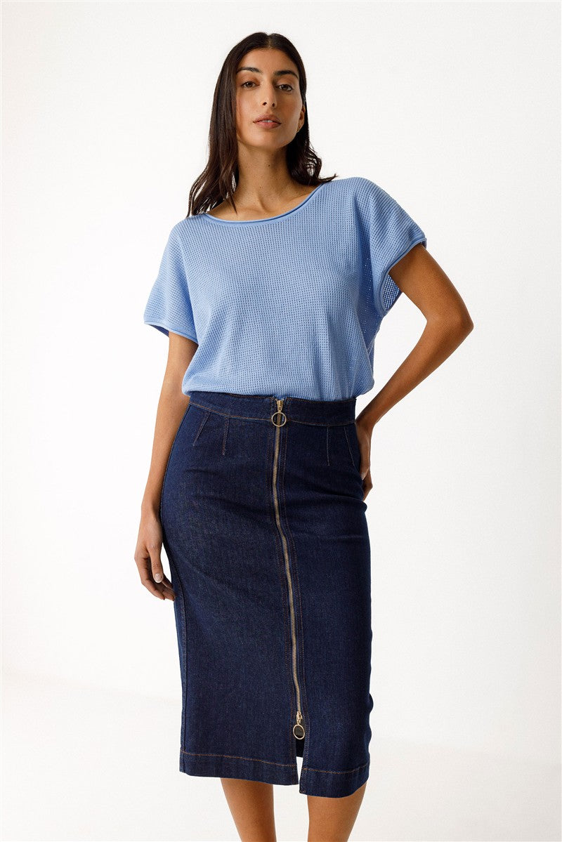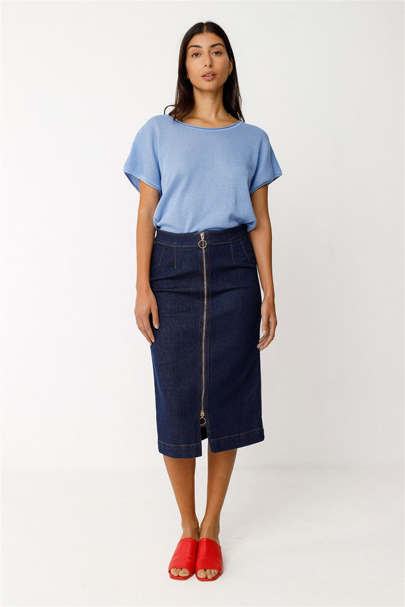 Rock Maixi von SKFK in dark denim, hergestellt aus 62% Baumwolle (Bio), 29% Baumwolle (Recycelt), 7%eat Und 2% Elasthan. Midilanger Bleistiftrock mit Reißverschluss auf der Vorderseite und aufgesetzten Taschen auf der Rückseite.