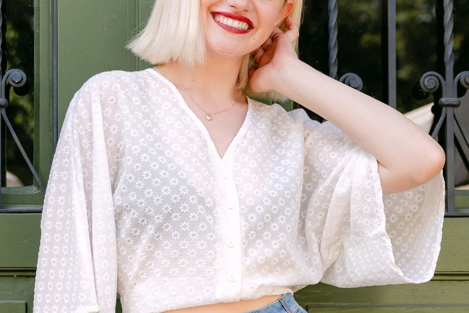 Die La Bohème Bluse von Mademoiselle YéYé überzeugt mit einer luftigen, femininen Silhouette und verspielten Details. Der leichte Webstoff mit feiner Stickerei verleiht der Bluse einen sommerlichen Look, während der V-Ausschnitt und die Knopfleiste vorne das Design klassisch abrunden.