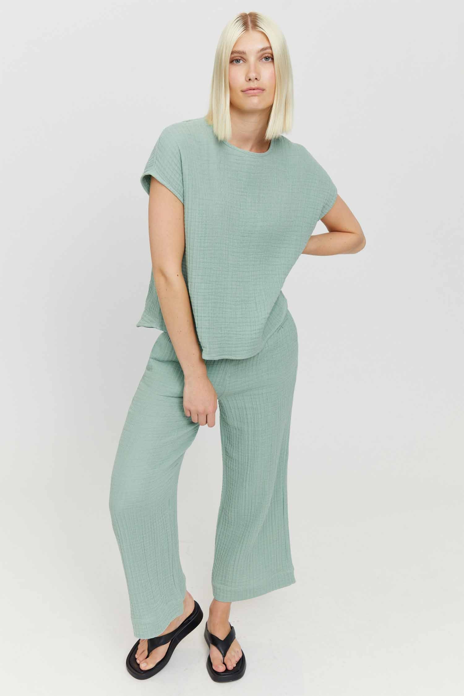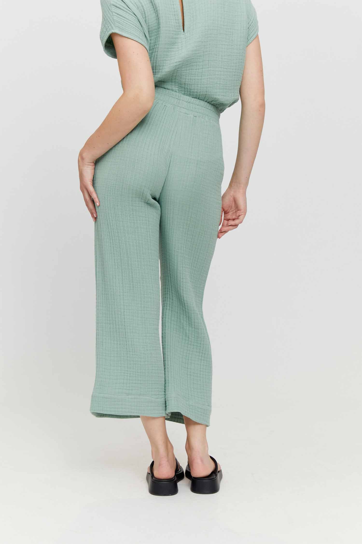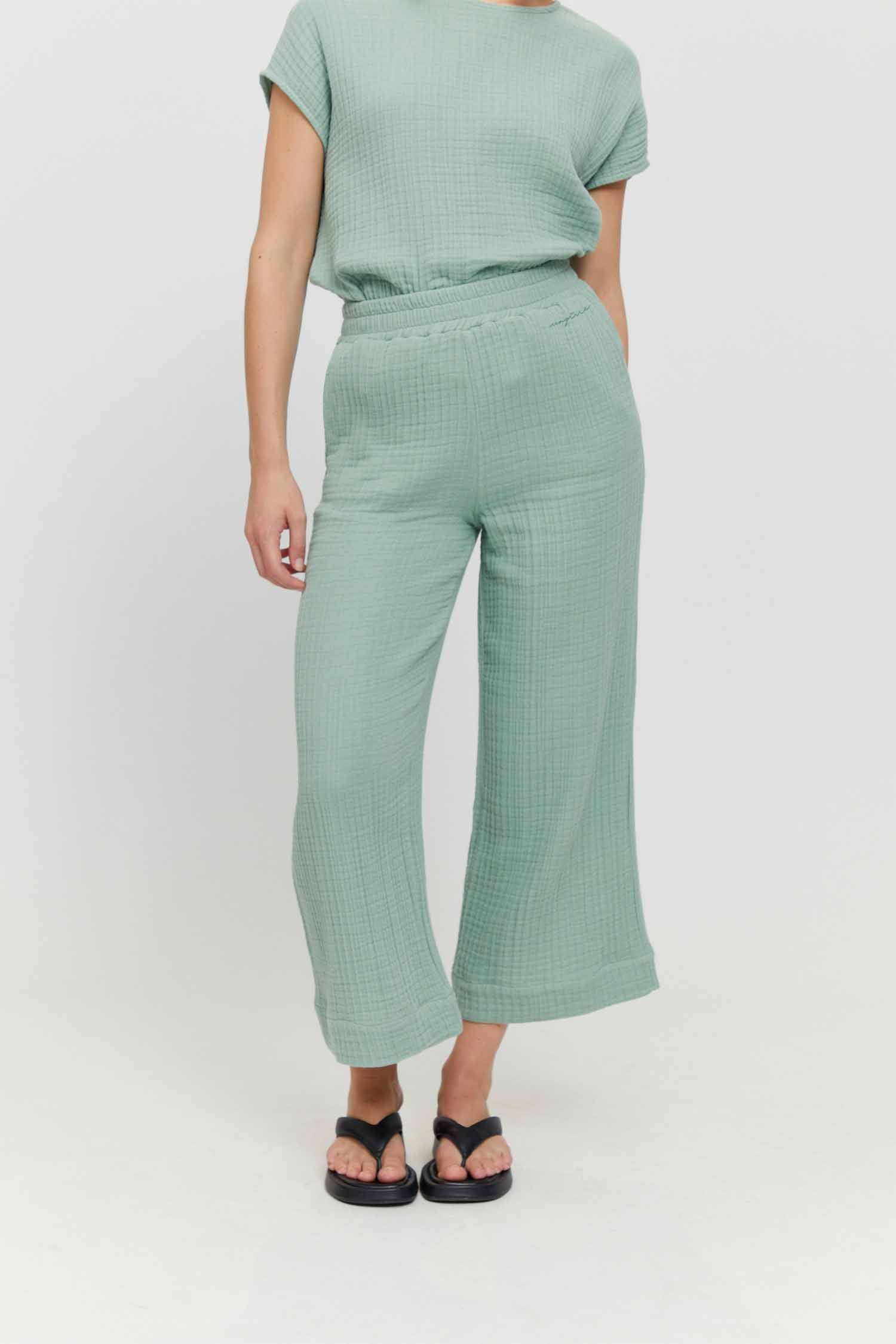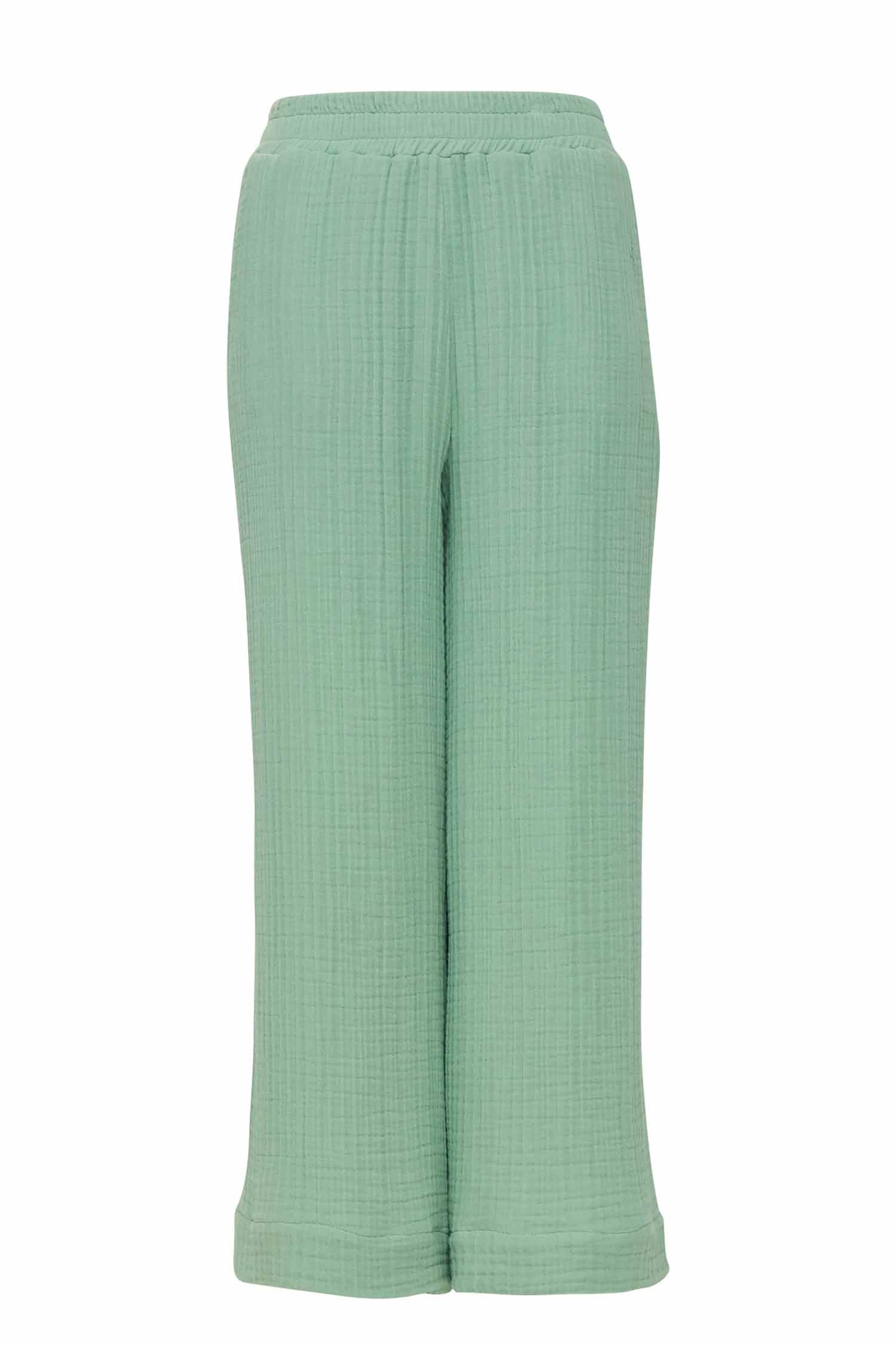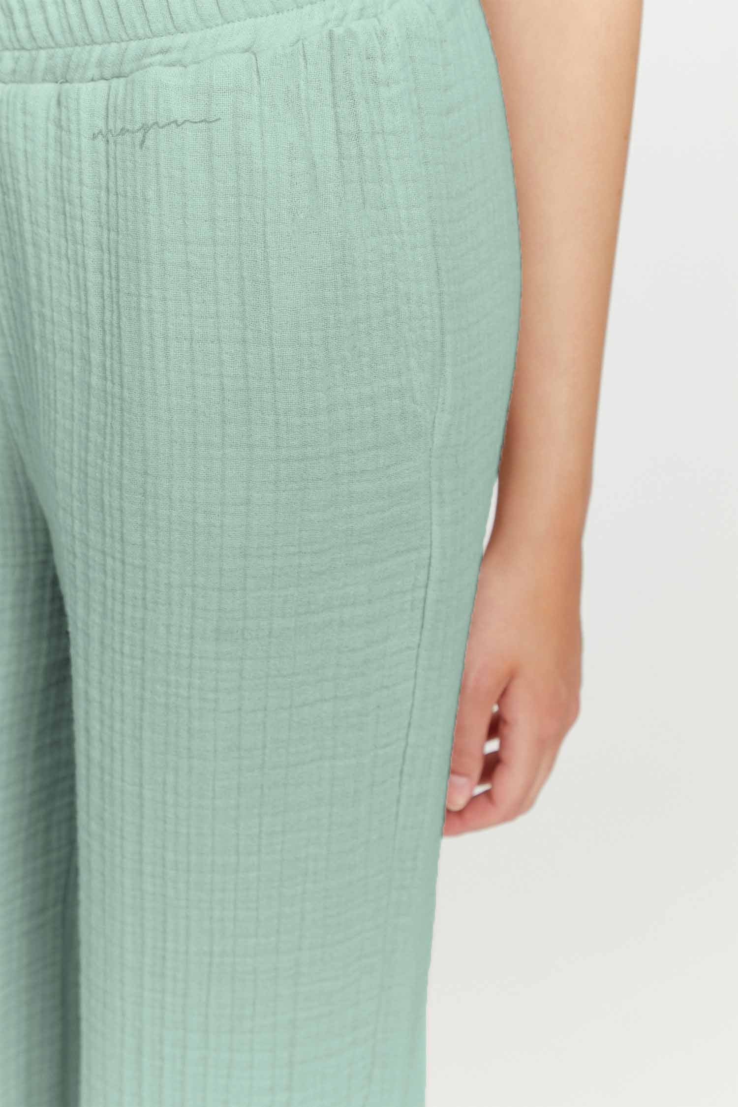 Die Sommerhose Donda von Mazine hat ein weites Bein und einen breiten elastischen Bund. Sie besteht aus einem angenehmen Musselin-Stoff und wurde aus 100% Baumwolle (bio) gefertigt.