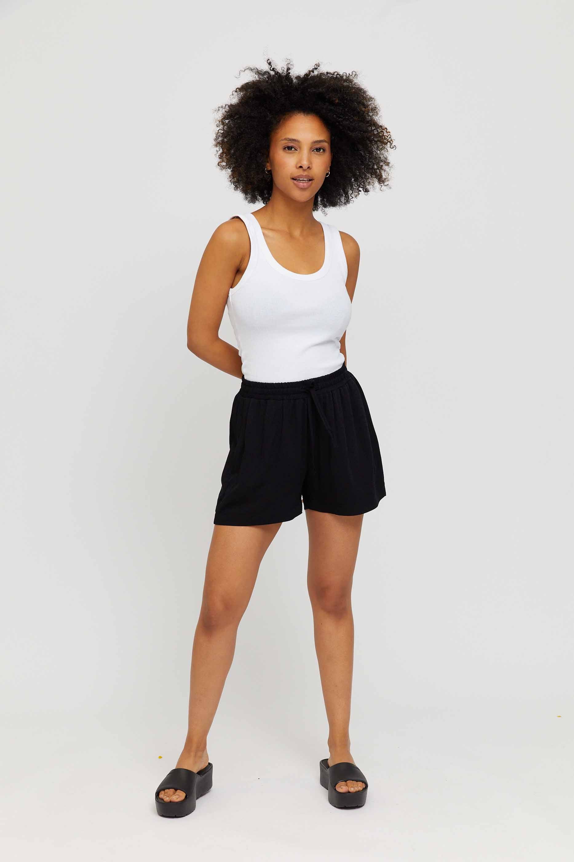 Die Shorts Palm von Mazine ist aus 100% Viskose gefertigt. Die kurze Hose ist weit geschnitten und hat einen elastischen Bund.