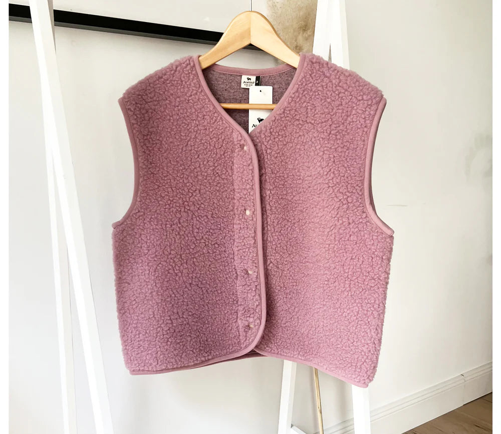 Die Weste "TYB" von ALWERO überzeugt durch ihre ultraleichte Qualität und den hohen Tragekomfort. Gefertigt aus 100 % mulesing-freier, Woolmark-zertifizierter Wolle, liegt sie sanft auf der Haut und bietet Wärme, ohne zu beschweren. Das Fleece mit Schaffellstruktur macht die Weste besonders weich und elastisch.