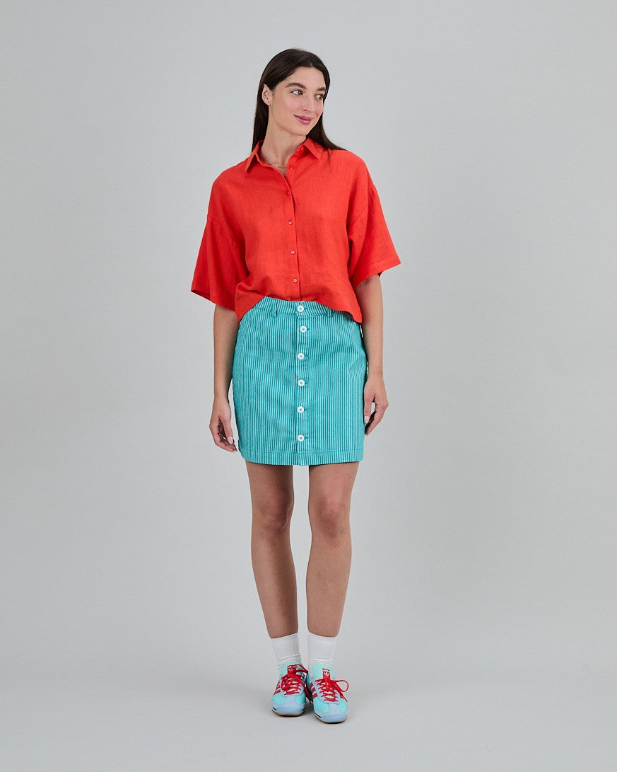 Denim Stripes Mini Skirt von BRAVA in green, hergestellt aus 46% Baumwolle (Bio) 34% Baumwolle (recycelt) 17% Polyester (recycelt) 3% anderen Fasern.