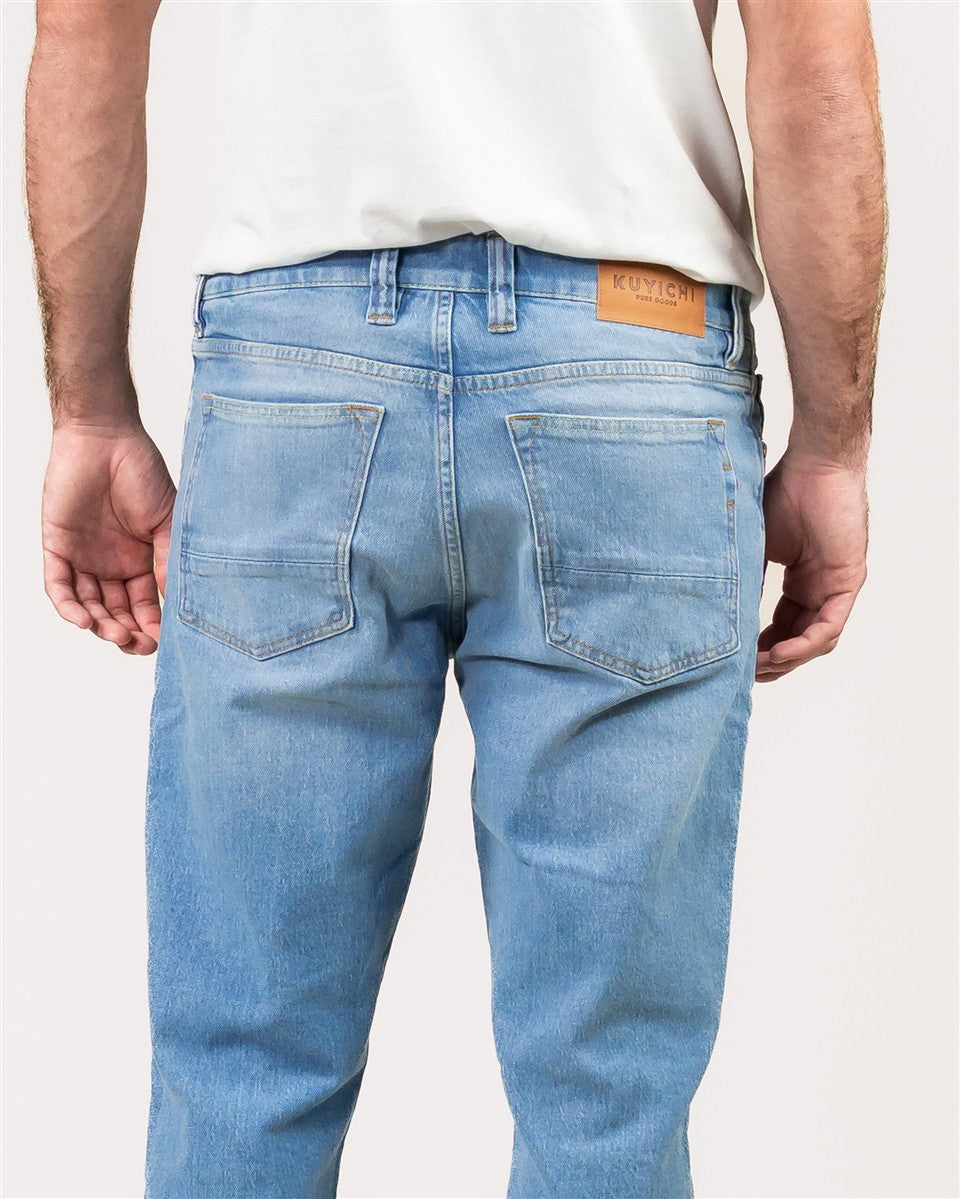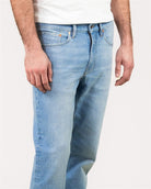 Der Denim besteht aus 67 % Bio-Baumwolle, 30 % pre-consumer recycelter Baumwolle, 2 % recyceltem Polyester und 1 % Elasthan. Durch die Wiederverwertung von Baumwollresten entsteht ein weiches, strapazierfähiges Material mit geringerem Ressourcenverbrauch. Der Stretch-Anteil sorgt zusätzlich für angenehmen Tragekomfort. Die Jeans wird klassisch mit Reißverschluss geschlossen.