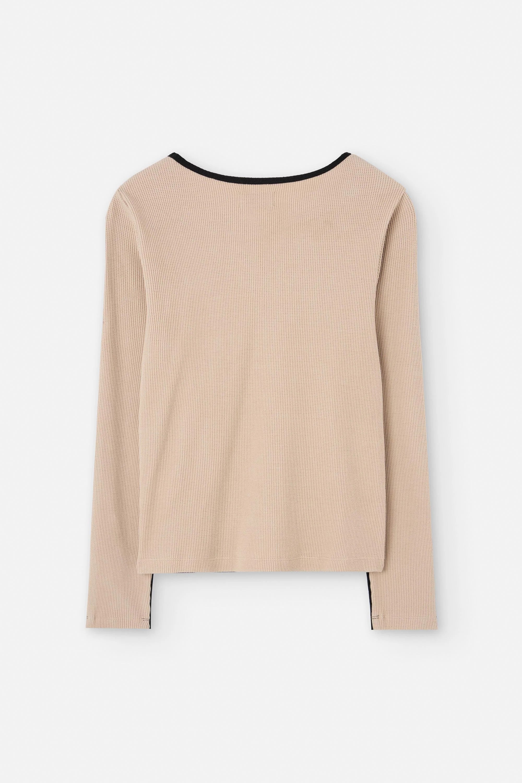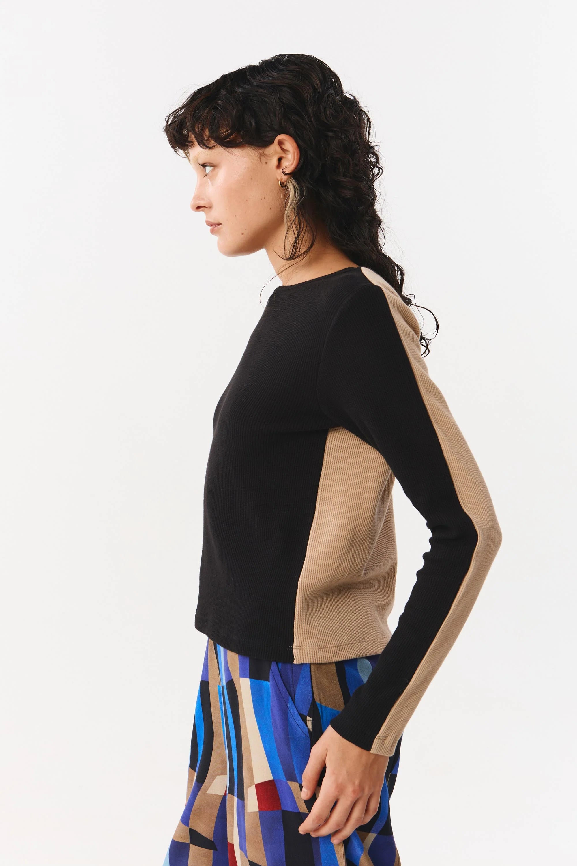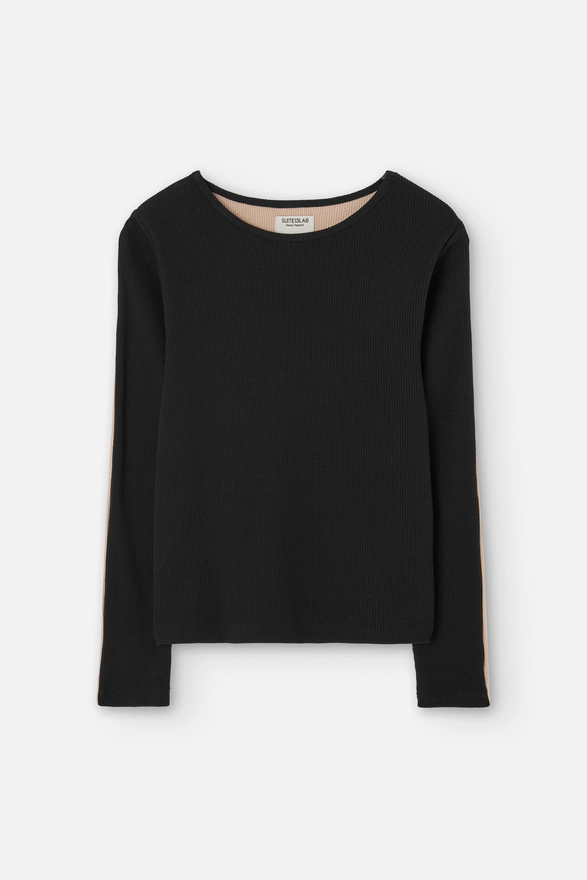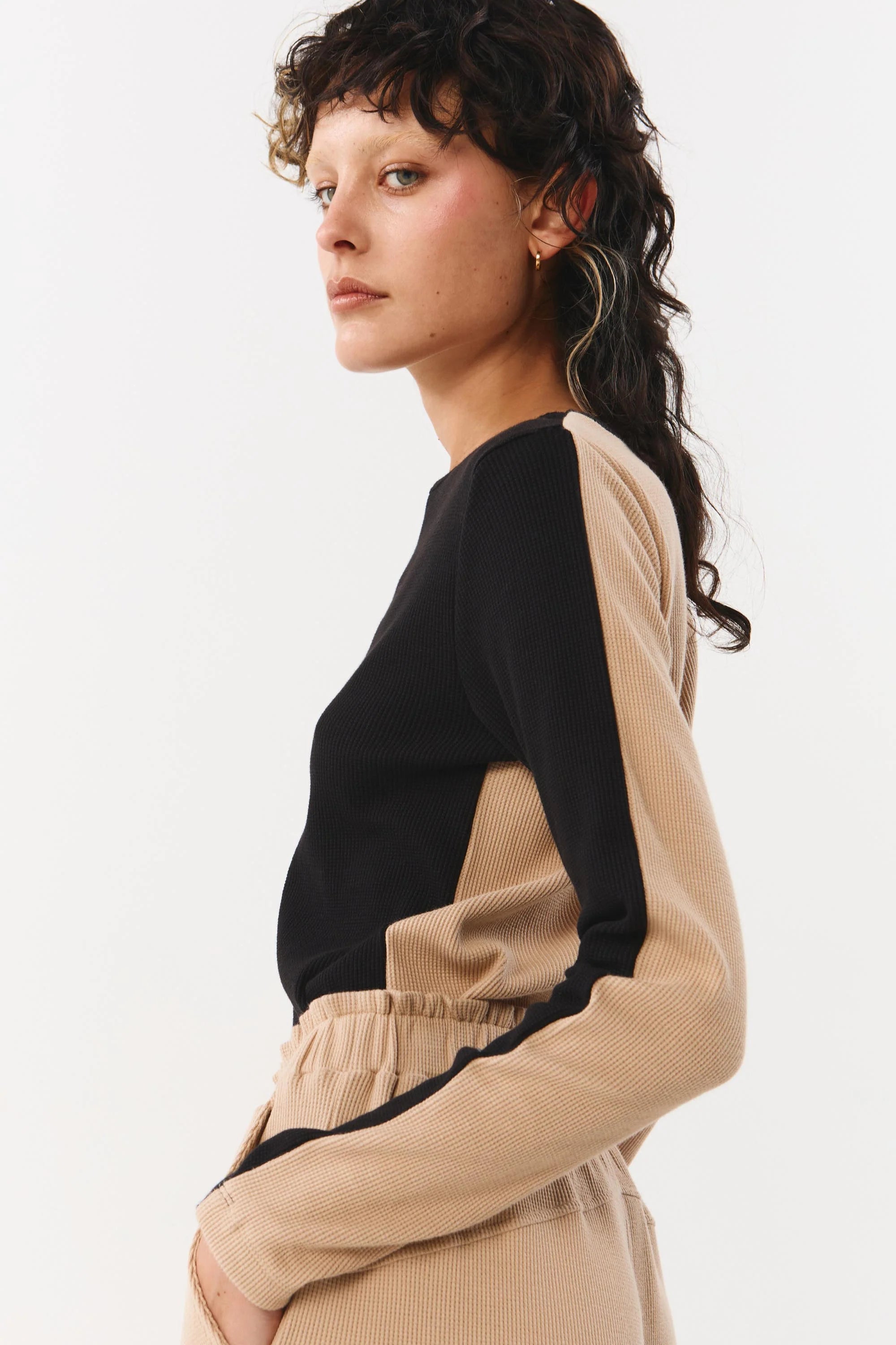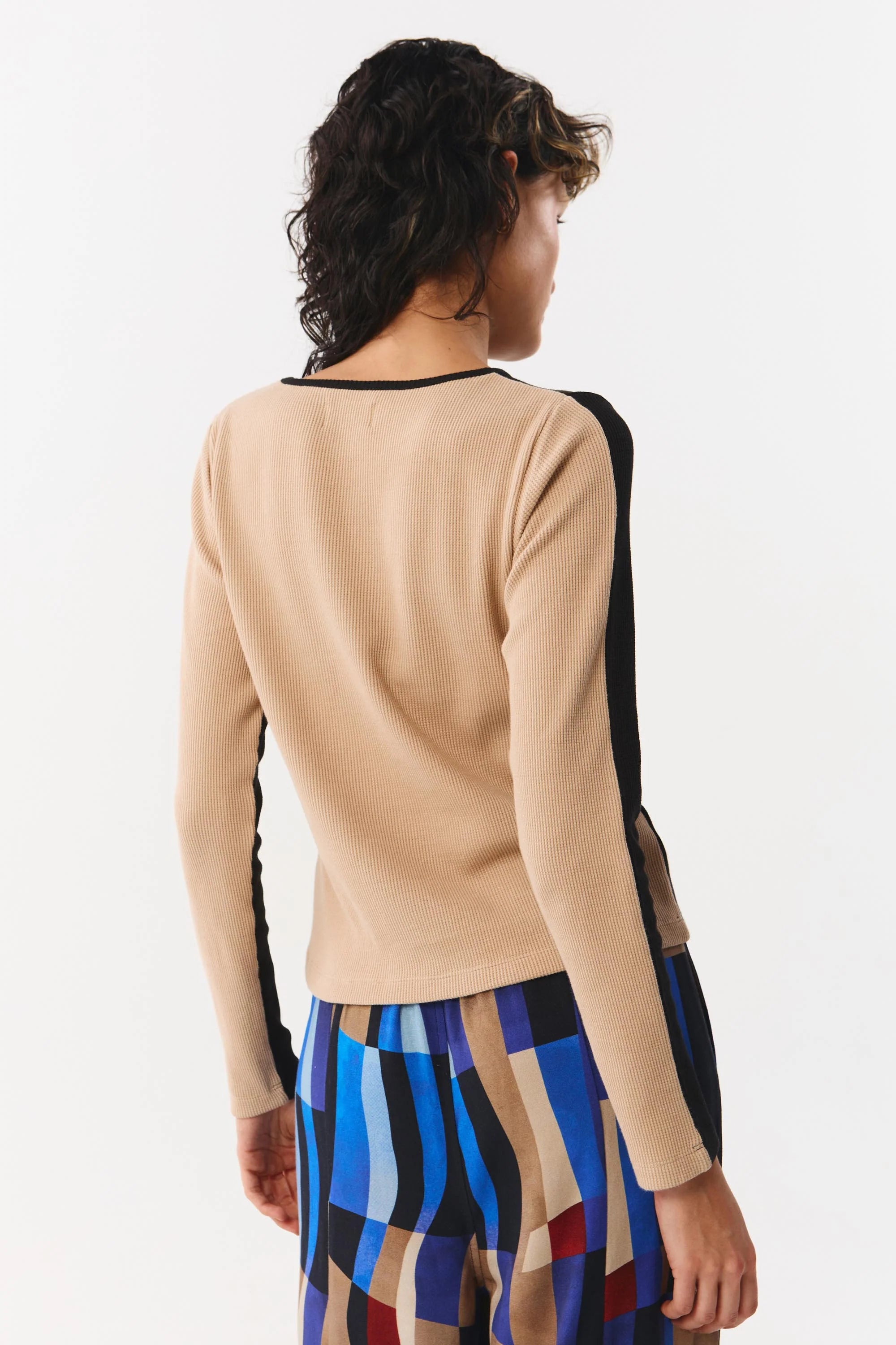 Das Albi Top von SUITE 13 bringt Kontrast und Komfort zusammen. Der zweifarbige Longsleeve besteht aus leichtem Waffelstoff aus 95 % Bio-Baumwolle und 5 % Elasthan. Das Material ist weich, atmungsaktiv und angenehm auf der Haut. Der runde Halsausschnitt sorgt für einen schlichten Look. Das Bicolor-Design verleiht dem Shirt einen urbanen und modernen Charakter. Einfach kombinieren, anziehen und wohlfühlen.