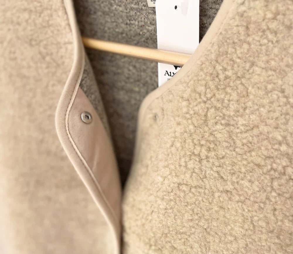 Die Weste "TYB" von ALWERO überzeugt durch ihre ultraleichte Qualität und den hohen Tragekomfort. Gefertigt aus 100 % mulesing-freier, Woolmark-zertifizierter Wolle, liegt sie sanft auf der Haut und bietet Wärme, ohne zu beschweren. Das Fleece mit Schaffellstruktur macht die Weste besonders weich und elastisch.
