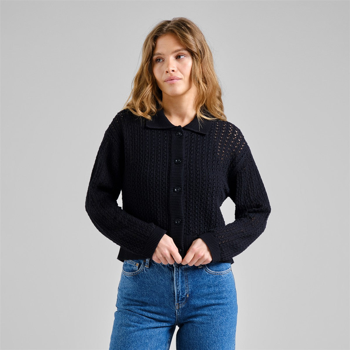 Knitted Cardigan Rosendal Crochet Black von DEDICATED gefertigt aus: 100% Baumwolle (Bio). Merkmale: Eine luftige Strickjacke mit normaler Passform und leicht verkürzter Länge, gefertigt aus einem von Häkeln inspirierten Pointelle-Muster für eine leichte Textur. Schwarz mit einem offenen Pointelle-Muster, das einen subtilen, luftigen Look verleiht. Die Passform liegt gut auf den Schultern und umrahmt den Körper mit einem tiefen V-Ausschnitt und gerippten Abschlüssen für ein sauberes Finish. Gestrickt aus Baumwolle (Bio) und GOTS-zertifiziert für verlässliche Qualität. Stylen Sie es über einem Tank mit High-Waisted-Jeans oder zugeknöpft mit einem Midirock.- 100% Baumwolle (Bio); GOTS-zertifiziert- Normale Passform; leicht verkürzte Länge- 7-Gauge-Pointelle-Strick- Tiefer V-Ausschnitt mit geripptem Kragen, Manschetten und Saum- Corozo-Knopfverschluss.