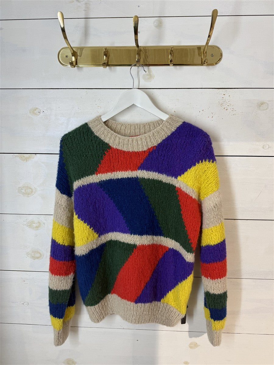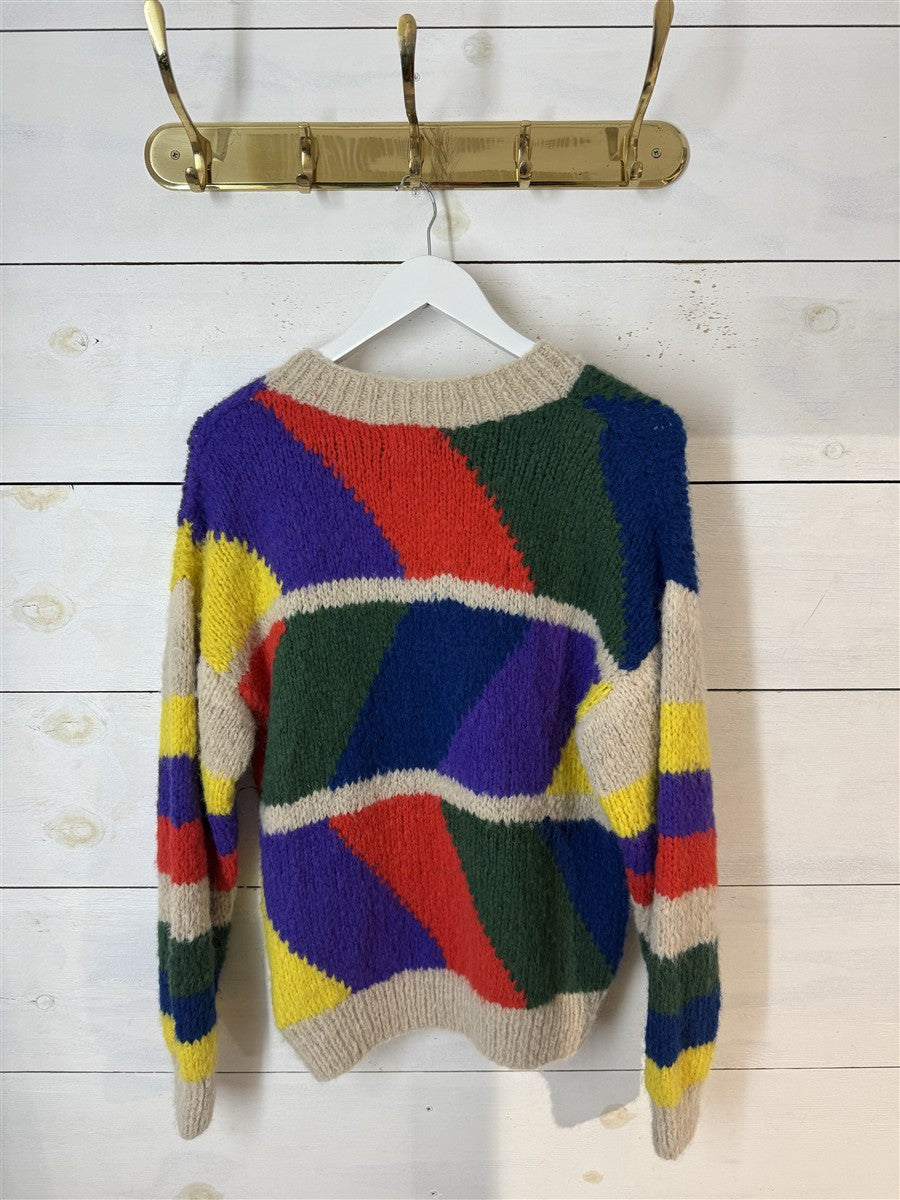 Der handgestrickte Pullover Dolores von INTI kombiniert klassisches Design mit luxuriöser Baby-Alpakawolle. Der Pullover verbreitet durch sein farbenfrohes Muster und den lässigen Schnitt sofort gute Laune.