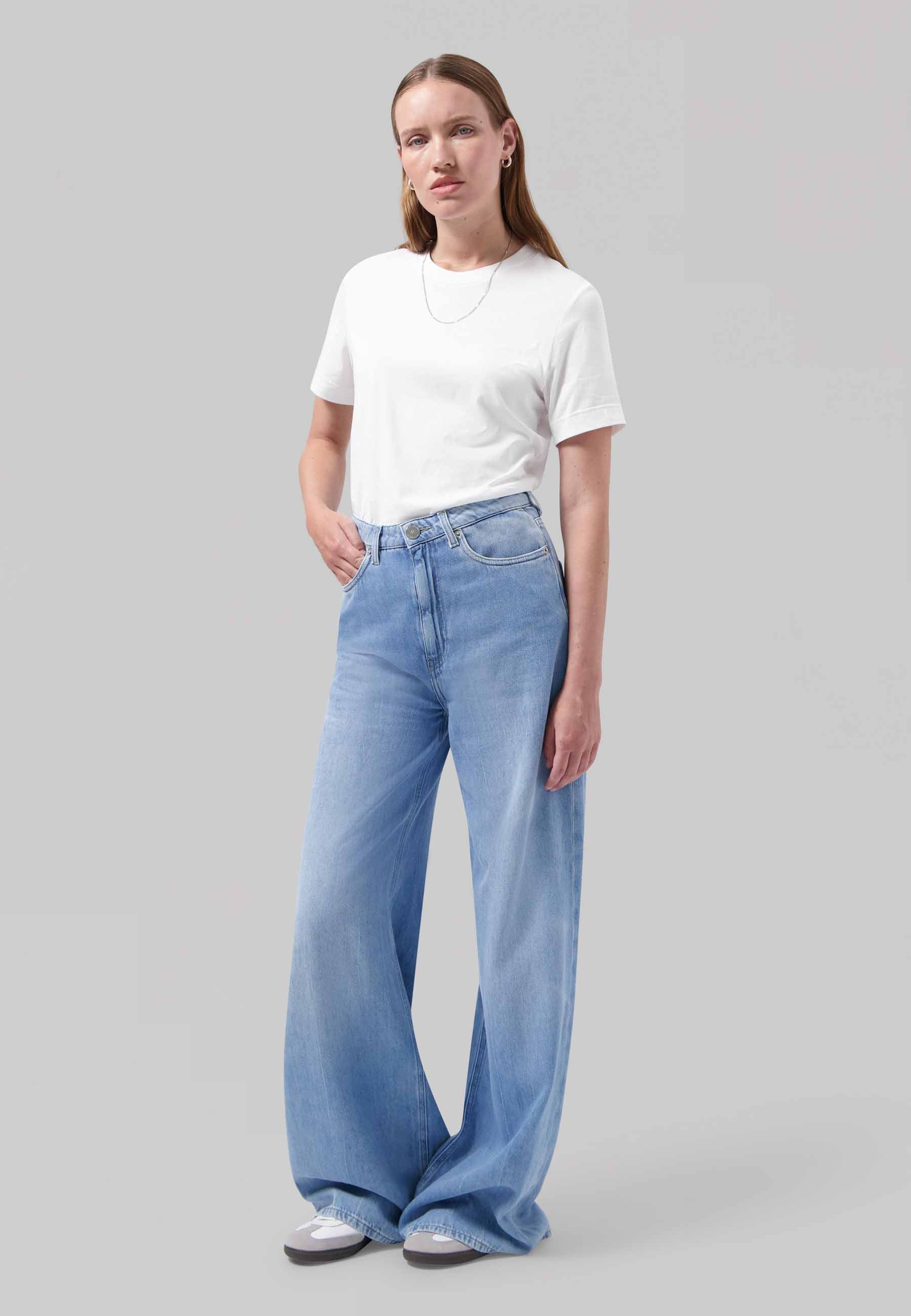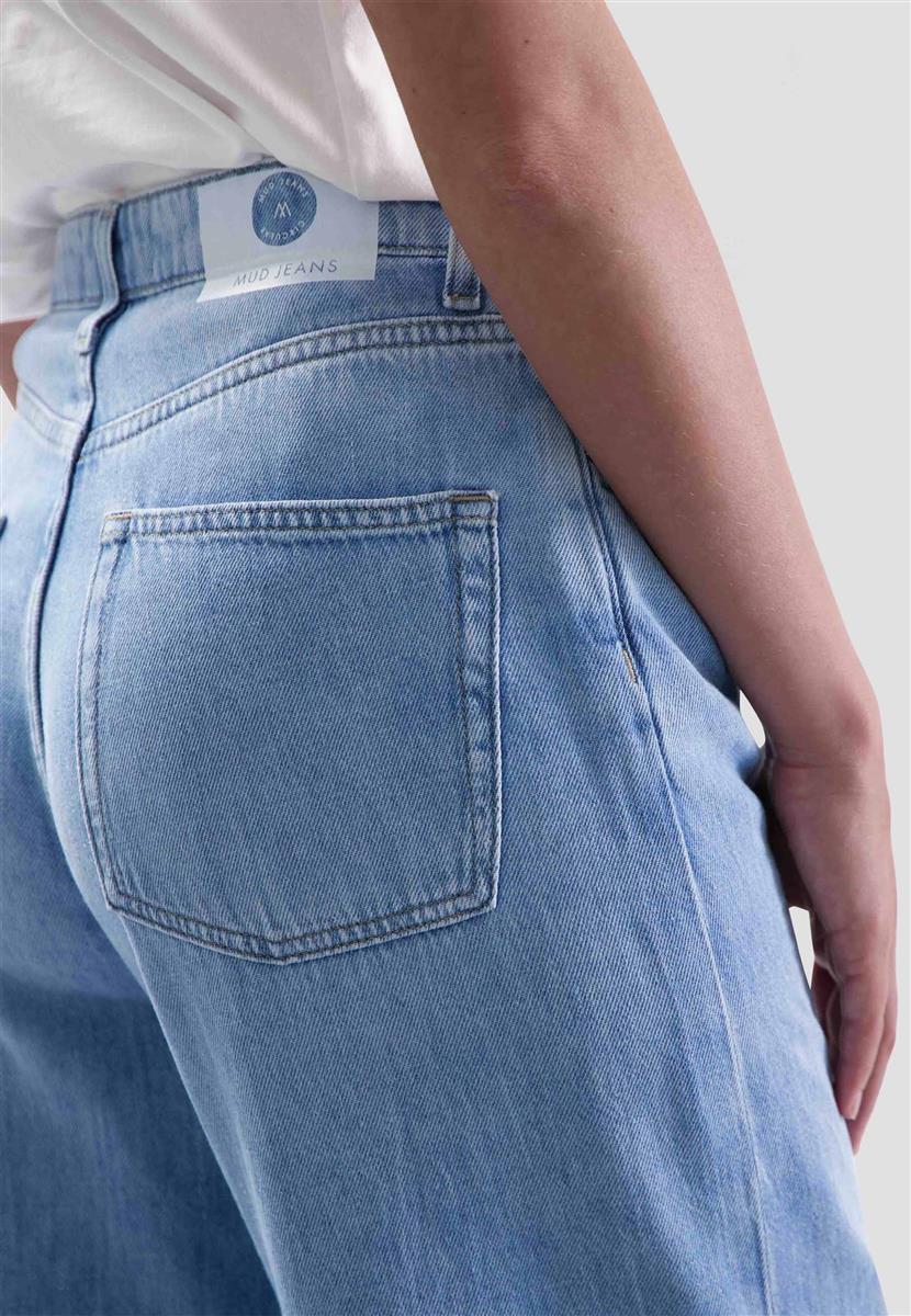 Die Five-Pocket-Jeans Wyde Sara Flow von Mud Jeans hat ein weites Bein und eine hohe Bundhöhe. Die Hose besteht aus 60% Baumwolle (bio), 20% Baumwolle (post-consumer recycelt) und 20% Leinen (pre-consumer recycelt).