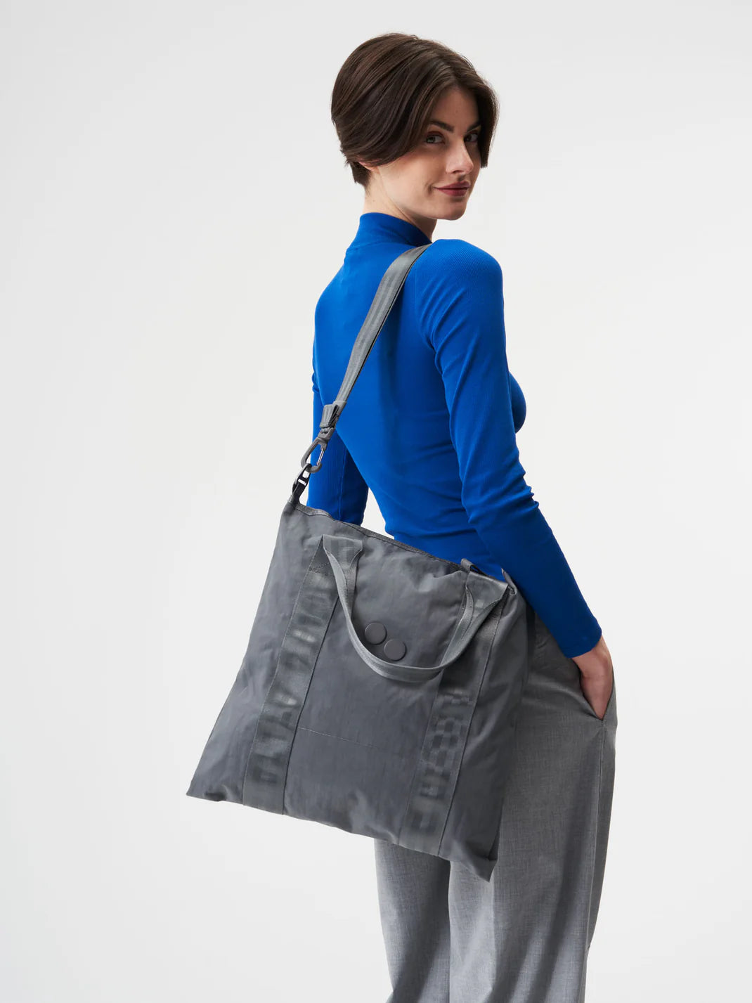 Die stylische Tote Bag von PINQPONQ ist universell anwendbar und bietet ausreichend Stauraum fürs Büro oder einen kleinen Einkauf. Sie lässt sich bequem über der Schulter tragen und dank ihrer Form flach und platzsparend verstauen. Das versteckte 3-Punkt Tragesystem verhindert verrutschen auf dem Rad. Das Außenmaterial aus Crinkle Woven besteht zu 100% aus recyceltem Nylon und ist wasserabweisend mit 1.500 mm Wassersäule und PFC-freier imprägnierung.