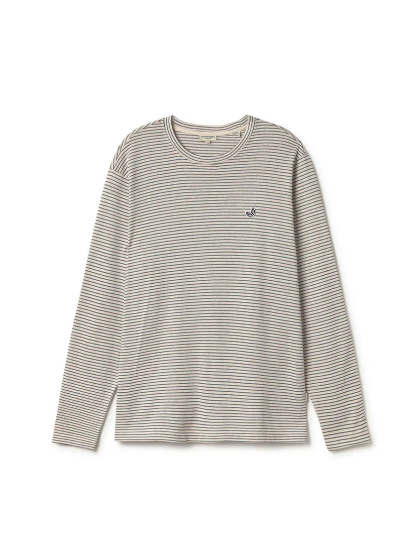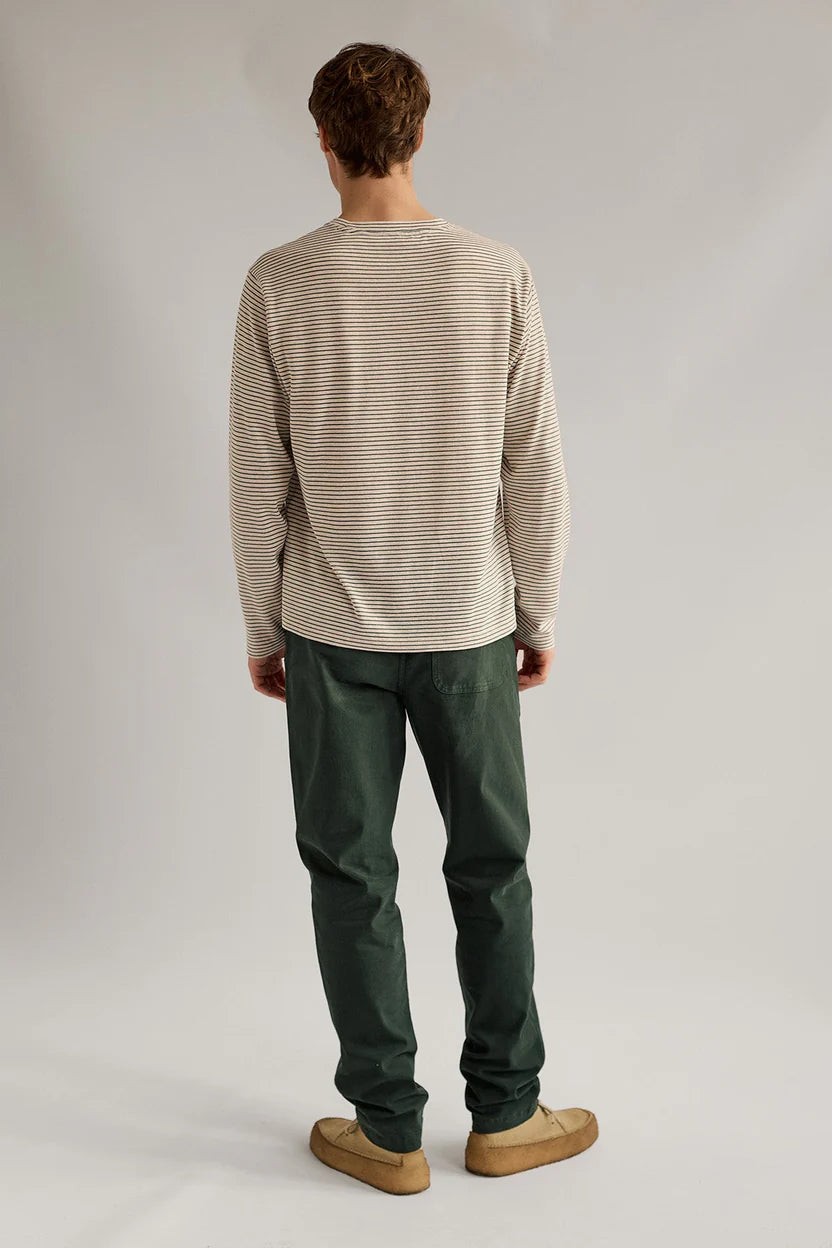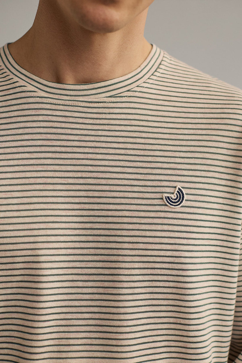 Das Langarmshirt Buddenhaggen in light green von TWOTHIRDS besteht aus 59% recycelten Polyester und 41% Baumwolle (Bio). Der Longsleeve mit dezenten horizontalen Nadelstreifenmuster kommt in einem bequemen regular Fit. Das Model ist 185 cm groß und trägt Größe M.
