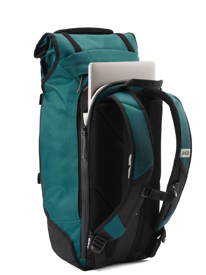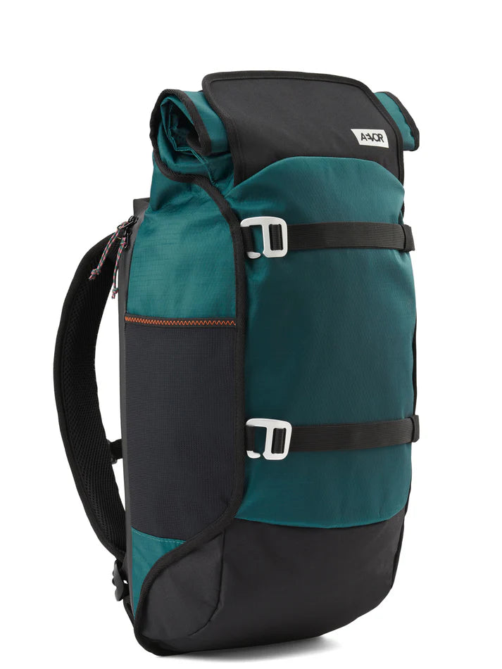 Der AEVOR Trip Pack Proof bietet 26–33 l Volumen dank Rolltop mit Klettverschluss und Rückenzugang per Rundum-Reißverschluss. Mit 800 g Gewicht, ergonomischen Schultergurten und atmungsaktivem Rückenteil sitzt er bequem im Alltag und auf Reisen. Ein 15″ Laptopfach, Netz-Seitenfach für Trinkflaschen und abnehmbarer Brustgurt sorgen für Funktionalität. Das Außenmaterial aus 100 % recyceltem PET, PFC-frei imprägniert und bluesign®-zertifiziert, ist stark wasserabweisend mit 13.000 mm Wassersäule.